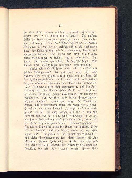 Haben wir uicht Beispiele erlebt, wie es abläuft mitsolche» Vediuguugeu? Es sind heute noch nicht sechsMonate über Deutschland hingegangen, daß wir sahen beiden Zvllangelegenheiten, wie in Baiern nnd in Württem-berg die radikalen Opponenten von allen Seiten versicherten:„Der Zollvertrag wird nicht angenommen, nnd die Zoll-einigung mit dem Norddeutschen Bunde wird nicht an-genommen, wenn nicht gewisse Bedingungen, die wir Herrenvorschreiben, von Preußen nnd seinen Bundesgenossenakzeptiert werden." Himmelhoch gingen die Wogen; inBaiern nnd Württemberg schien der Zollverein verloren,Opposition von allen Seiten! „Preußen mnß uns nach-geben! Es hat nns uoch nötiger, als wir es, nnd wirschreiben ihm vor: diese uud jeue Abänderung in der ge-ineinsamen Gesetzgebung mnß gemacht werden, wenn wirden Zollvertrag annehmen sollen." Und was geschah?! —Im letzten Augenblick nahm die Sache ein klägliches Ende.Die am lautesten geschrieen hatten, zogen sich am erstenzurück, uud — verzeihen Sie den burschikosen Ausdruck —aus dieser Strvhrenvmmage kam nichts heraus, als eineBlamage. (Bravo ! Heiterkeit.) — In derselben Lage sindwir, wenn wir dem Norddeutscheu Buude Bedingungen vor-schreiben, die wir uicht ertrotzen köunen. Dieses Vor-