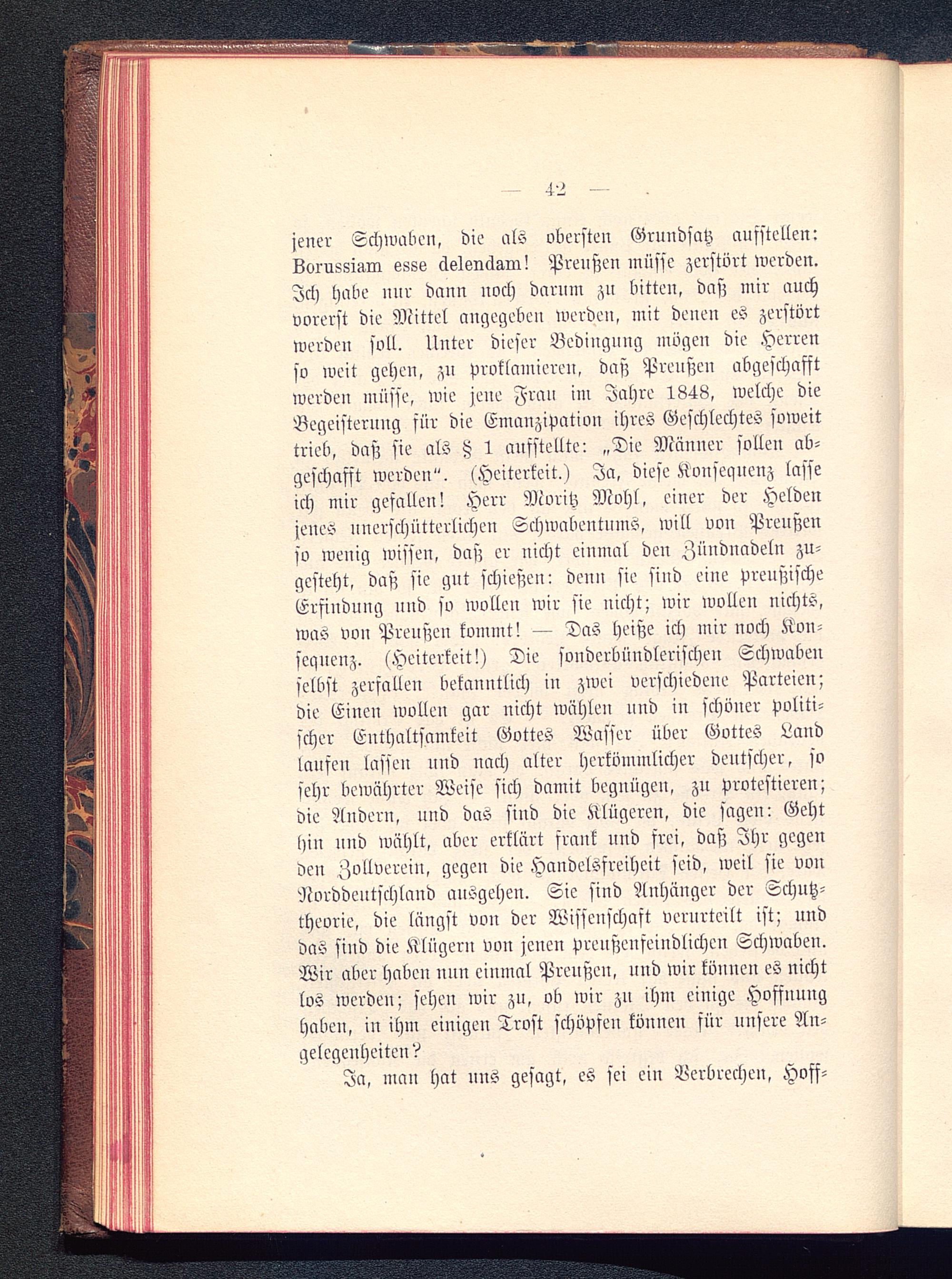 jener Schwaben, die als obersten Grundsatz aufstellen:LorussiAM esss äslsnclaiir! Preußen müsse zerstört werden.Ich habe nur dnuu nach darum zu bitten, daß mir auchvorerst die Mittel angegeben werden, mit denen es zerstörtwerden soll. Unter dieser Bedingung mögen die Herrenso weit gehen, zu proklamieren, daß Preußeu abgeschafftwerden müsse, wie jene Frau im Jahre 1848, welche dieBegeisterung sür die Emanzipation ihres Geschlechtes soweittrieb, daß sie als 1 aufstellte: „Die Männer sollen ab-geschafft werden". (Heiterkeit.) Ja, diese Konsequenz lasseich mir gefallen! Herr Moritz Mohl , einer der Heldenjenes unerschütterlichen Schwabentums, will von Prenßenso wenig wissen, daß er nicht einmal den Zünduadeln zu-gesteht, daß sie gut schießen: denn sie sind eine preußischeErfindung und sv wollen wir sie nicht; wir wollen nichts,was von Prenßen kommt! — Das heiße ich mir noch Kon-sequenz. (Heiterkeit!) Die sonderbündlerischen Schwabenselbst zerfallen bekanntlich in zwei verschiedene Parteien;die Einen wollen gar uicht wählen und in schöner politi-scher Enthaltsamkeit Gottes Wasser über Gottes Landlausen lassen und nach alter herkömmlicher deutscher, sosehr bewährter Weise sich damit begnügen, zu protestieren;die Andern, und das sind die Klügeren, die sagen: Gehthin und wählt, aber erklärt srank und frei, daß Ihr gegenden Zollverein, gegen die Handelsfreiheit seid, weil sie vonNvrddeutschland ausgehen. Sie sind Anhänger der Schutz-theorie, die längst von der Wissenschaft verurteilt ist; unddas sind die Klügern von jenen preußenfeindlichen Schwaben.Wir aber haben nun einmal Preußen, nnd wir können es nichtlos werde»; sehen wir zu, ob wir zu ihm einige Hoffnunghaben, in ihm einigen Trost schöpfen können für uusere An-gelegenheiten?