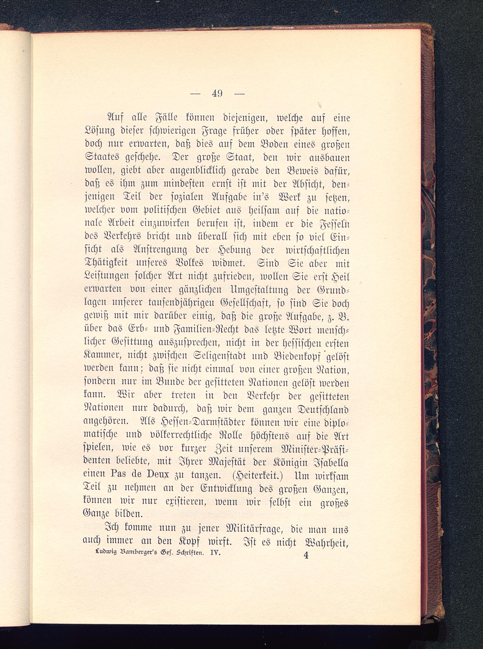 Auf alle Fälle können diejenigen, welche auf eineLösung dieser schwierigen Frage früher oder später hoffen,doch uur erwarten, daß dies auf dem Bodeu eines großenStaates geschehe. Der große Staat, den wir ansbanenwollen, giebt aber augenblicklich gerade den Beweis dafür,daß es ihm zum mindesten ernst ist mit der Absicht, den-jenigen Teil der sozialen Aufgabe iu's Werk zu setzen,welcher vom politischeu Gebiet aus heilsam auf die natio-nale Arbeit einzuwirken berufen ist, indem er die Fesselndes Verkehrs bricht und überall sich mit eben so viel Ein-sicht als Anstrengung der Hebung der wirtschaftlichenThätigkeit unseres Volkes widmet. Sind Sie aber mitLeistungen solcher Art nicht zufrieden, wollen Sie erst Heilerwarten von einer gänzlichen Umgestaltung der Grund-lagen unserer tausendjährigen Gesellschaft, so siud Sie dochgewiß mit mir darüber einig, daß die große Aufgabe, z. B.über das Erb- und Familien-Recht das letzte Wort mensch-licher Gesittung auszusprechen, nicht in der hessischen erstenKammer, nicht zwischen Seligenstadt nnd Bicdenkops gelöstwerden kann : daß sie nicht einmal von einer großen Nation,sondern nur im Bunde der gesitteten Nationen gelöst werdenkann. Wir aber treten in den Verkehr der gesittetenNationen nur dadurch, daß wir dein ganzen Deutschland angehören. Als Hesfen-Darmstädter können wir eine diplo-matische nnd völkerrechtliche Rolle höchstens auf die Artspielen, wie es vor kurzer Zeit unserem Minister-Präsi-denten beliebte, mit Ihrer Majestät der Königin Jsabellaeinen ?as äe vsux zn tanzen. (Heiterkeit.) Um wirksamTeil zu nehmen an der Entwicklung des großen Ganzen,können wir nur existiere», wenn wir selbst ein großesGanze bilden.