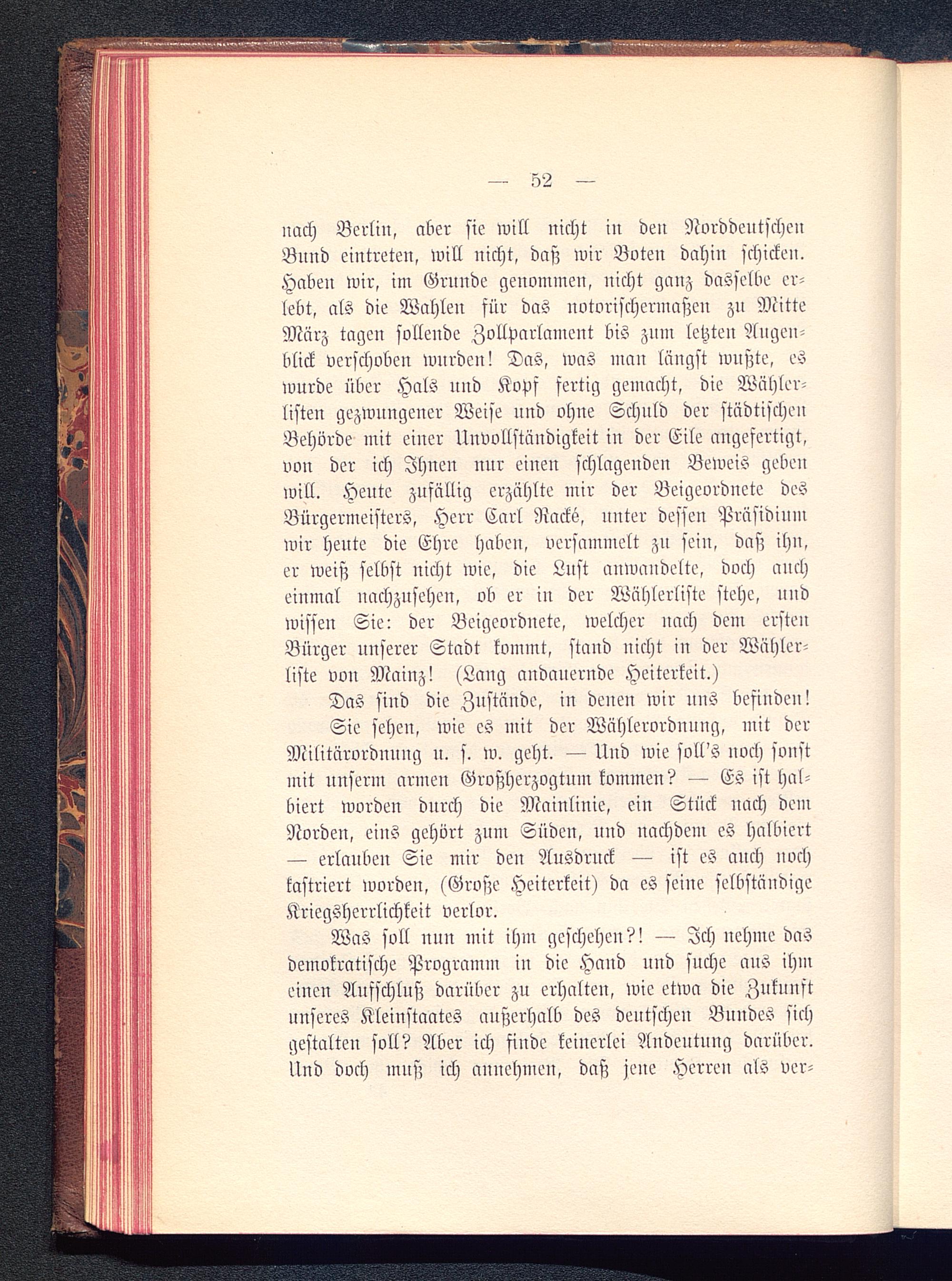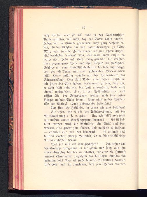 Sie sehen, wie es mit der Wählerordnung, mit derMilitärvrdnnng u. s. w. geht. — Uud wie soll's uoch sonstmit unserm armen Großherzogtum kommen? — Es ist hal-biert worden durch die Mainliuie, ciu Stück uach demNorden, eins gehört zum Süden, und nachdem es halbiert— erlauben Sie mir den Ausdruck — ist es auch nochkastriert worden, (Große Heiterkeit) da es seine selbständigeKriegsherrlichkeit verlor.