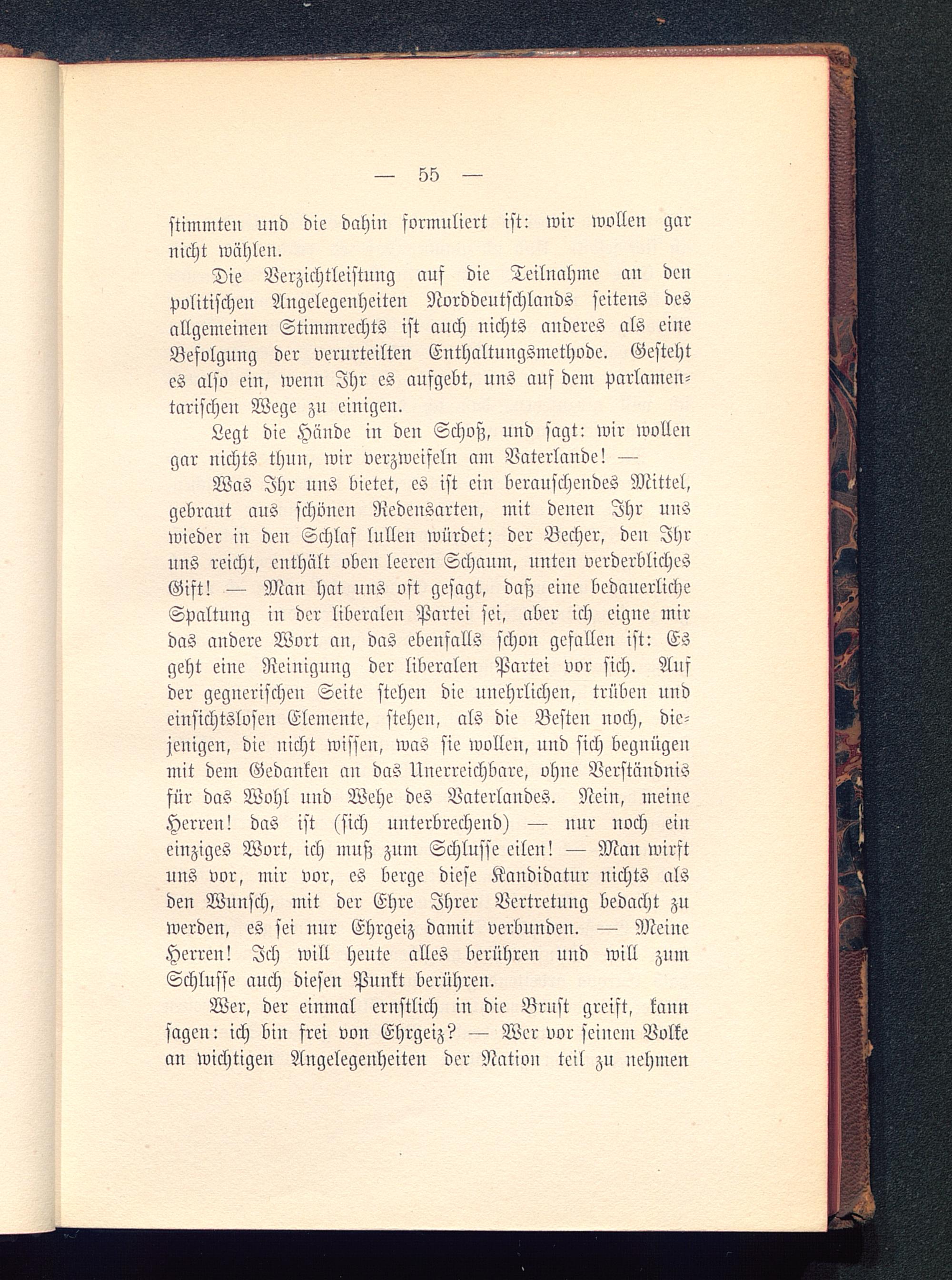 Was Ihr uns bietet, es ist ein berauschendes Mittel,gebraut aus schönen Redensarteu, mit denen Ihr unswieder in den Schlaf lullen würdet; der Becher, den Ihruns reicht, enthält oben leeren Schaum, uuten verderblichesGift! — Man hat uus oft gesagt, daß eine bedauerlicheSpaltung in der liberalen Partei sei, aber ich eigne mirdas andere Wort an, das ebenfalls schon gefallen ist: Esgeht eine Reinigung der liberalen Partei vor sich. Aufder gegnerischen Seite stehen die unehrlichen, trüben undeinsichtslosen Elemente, stehen, als die Besten noch, die-jenigen, die nicht wissen, was sie wollen, uud sich begnügenmit dem Gedanken an das Unerreichbare, ohne Verständnisfür das Wohl und Wehe des Vaterlandes. Nein, meineHerren! das ist (sich unterbrechend) — nnr noch eineinziges Wort, ich muß zum Schlüsse eileu! — Man wirftuns vor, mir vor, es berge diese Kandidatur nichts alsden Wunsch, mit der Ehre Ihrer Vertretung bedacht zuwerden, es sei nur Ehrgeiz damit verbundeu. — MeineHerren! Ich will heute alles berühren uud will zumSchlüsse auch dieseu Punkt berühren.
