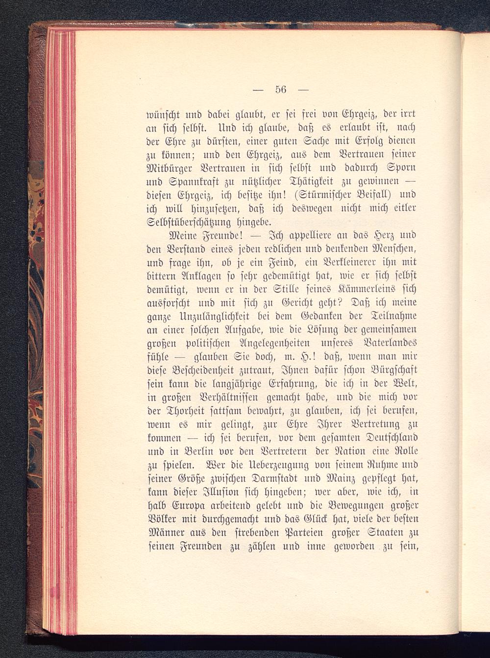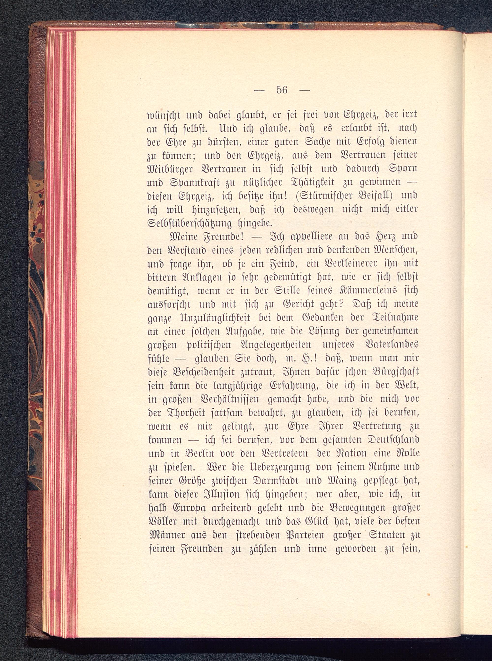 Meine Freunde! — Ich appelliere an das Herz undden Verstand eines jeden redlichen und denkenden Menschen,und frage ihn, ob je ein Feind, ein Verkleinerer ihn mitbittern Anklagen so sehr gedemütigt hat, wie er sich selbstdemütigt, wenn er in der Stille seines Kämmerleins sichausforscht und mit sich zu Gericht geht? Daß ich meineganze Unzulänglichkeit bei dem Gedanken der Teilnahmean einer solchen Aufgabe, wie die Lösung der gemeinsamengroßen politischen Angelegenheiten unseres Vaterlandesfühle — glauben Sie doch, m. H.! daß, wenn man mirdiese Bescheidenheit zutraut, Jhneu dafür schon Bürgschaftsein kann die langjährige Erfahrung, die ich in der Welt,in großen Verhältnissen gemacht habe, und die mich vorder Thorheit sattsam bewahrt, zu glauben, ich sei berufen,wenn es mir gelingt, zur Ehre Ihrer Vertretung zukommen — ich sei berufen, vor dem gesamten Deutschland und in Berlin vor den Vertretern der Nation eine Rollezu spielen. Wer die Ueberzeugung von seinem Ruhme uudseiner Größe zwischen Darmstadt nnd Mainz gepflegt hat,kann dieser Illusion sich hingeben; wer aber, wie ich, inhalb Europa arbeitend gelebt und die Bewegungen großerVölker mit durchgemacht uud das Glück hat, viele der bestenMänner aus den strebenden Parteien großer Staaten zuseinen Freunden zu zählen und inne geworden zu sein,
