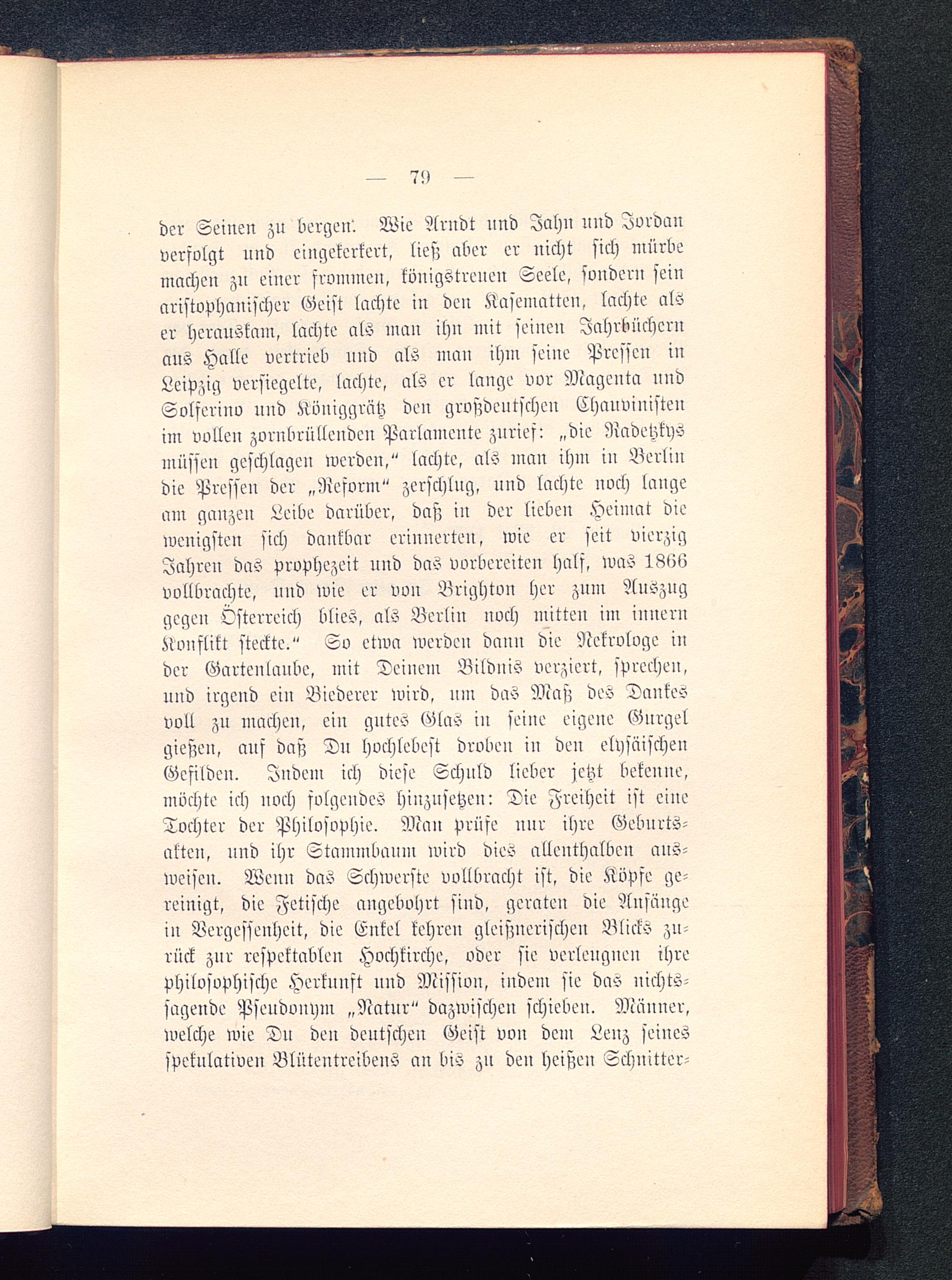 der Seinen zu bergen'. Wie Arndt und Iahn und Jordanverfolgt nnd eingekerkert, lies; aber er nicht sich mürbemachen zn einer frommen, kvniastreuen Seele, svndern seinaristophanischer Geist lachte in den Kasematten, lachte alser herauskam, lachte als man ihn mit seinen Jahrbüchernaus Halle vertrieb und als man ihm seine Pressen inLeipzig versiegelte, lachte, als er lange vor Magenta nndSolferino nnd Kvniggrätz den großdeutschen Chauvinistenim vollen zornbrüllenden Parlamente zurief: „die Radetzkysmüssen geschlagen werden," lachte, als man ihm in Berlin die Pressen der „Reform" zerschlug, und lachte noch langeam ganzen Leibe darüber, daß in der lieben Heimat diewenigsten sich dankbar erinnerten, wie er seit vierzigJahren das prophezeit und das vorbereiten half, was 1866vollbrachte, uud wie er von Brighton her zum Auszuggegen Österreich blies, als Berlin noch mitten im innernKonflikt steckte." So etwa werden dann die Nekrologe inder Gartenlaube, mit Dciuem Bildnis verziert, sprechen,und irgeud ein Biederer wird, nni das Maß des Dankesvoll zu mache», ein gutes Glas in seine eigene Gurgelgießen, auf daß Du hochlebest droben in deu elpsäische»Gefilden. Indem ich diese Schuld lieber jetzt bekenne,mochte ich noch folgendes hinzusetzen: Die Freiheit ist eineTochter der Philosophie. Man prüfe nur ihre Geburts-akten, nnd ihr Stammbauin wird dies allenthalben aus-weise». Wenn das Schwerste vollbracht ist. die Köpfe ge-reinigt, die Fetische angebohrt sind, geraten oie Ansängein Vergessenheit, die Enkel kehre» gleiß»erische» Blicks zu-rück znr respektablen Hochkirche, oder sie verleugne» ihrephilosophische Herkunft uud Missio», indem sie das nichts-sagende Psendvnvm „Natur" dazunschen schieben. Männer,welche wie Du den deutschen Geist von dein Lenz seinesspekulativen Blütentreibens an bis zn den heißen Schnitter-