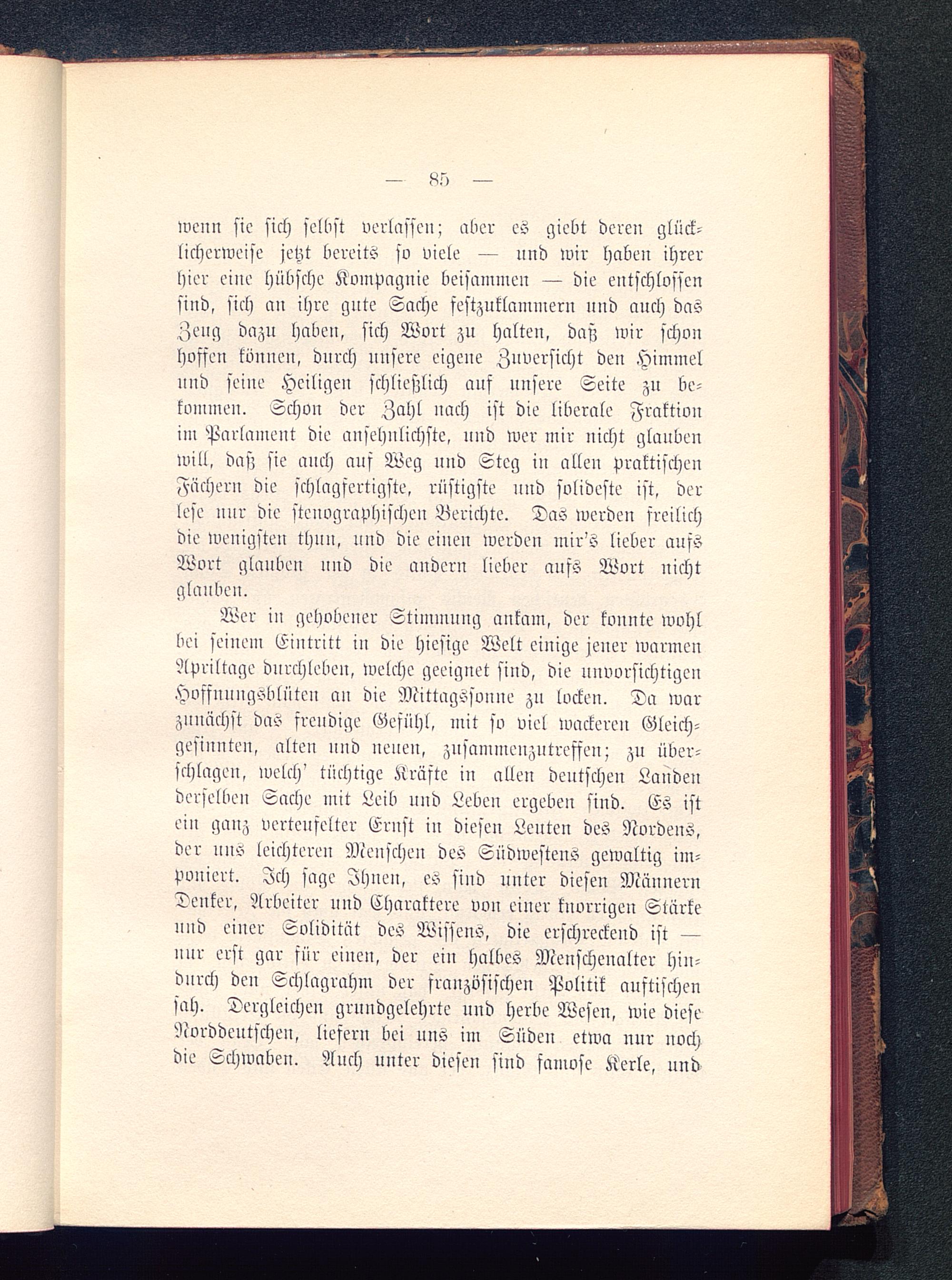 Wer in gehobener Stimmung ankam, der konnte wohlbei seinem Eintritt in die hiesige Welt einige jener warmenApriltage durchlebe», welche geeignet sind, die unvorsichtigenHvsfnnngobiüten an die Mittagssonne zn locken. Da warzunächst das freudige Gefühl, mit so viel wackeren Gleich-gesinnten, alten nnd neue», zusammenzutreffen; zu über-schlagen, welch' tüchtige Kräfte in allen deutschen Laudeuderselbe» Sache mit Leib und Leben ergeben sind. Es istein ganz verteufelter Ernst iu dieseu Leuten des Nvrdeus,der uns leichtere» Meuscheu des Südwestens gewaltig im-poniert. Ich sage Ihnen, es sind unter diesen MännernTenker, Arbeiter und Charaktere vvu einer knorrigen Stärkeuud einer Solidität des Wissens, die erschreckend ist —nur erst gar für eiucu, der eiu halbes Menschenalter hin-durch den Schlagrahm der französischen Politik austischensah. Dergleichen grundgelehrte uud herbe Weseu, wie dieseNorddeutschen, liefern bei uns im Süden etwa nur nochdie Schwaben. Auch unter diesen sind famose Kerle, und
