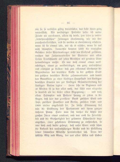 wie sie so verbissen giftig drcinblickcu, das steht ihnen ganzvvrtrefslich. Als vorsichtiger Politiker sollte ich meineFeinde nie anerkennen, allein ich denke, jene lesen ja unsere„bettelpreußischen" Zeitungen ebensowenig, wie wir ihrepreußeufrcsserischen, und sie werden es ebensowenig erfahren,wenn ich sie einmal lobe, wie ich es erfahre, wenn sie ausmich schimpfen. Immerhin konnten selbst die trutzigstenGesichter dieser Württemberger nicht den Eindruck zerstören,welchen das Zusammentreffen der Vertreter ans alle»Teilen Teutschlands ans jeden Menschen mit geradem Sinnhervorbringen mußte. Es war doch einmal etwas merk-würdiges, etwas zu merkwürdiges, um gauz unfruchtbarund erfolglos zu bleiben: daß znm erstenmal überhaupt dieAbgeordneten des deutschen Volks in der größten Stadtdes größten deutschen Reichs zusammentraten und damitden Grundstein zu einer künftigen Hauptstadt des künftigendeutschen Staates wie zur künftigen Gesamtvertretnng derkünftigen Nation legten — (denn sehr im Beginnen undim Werden ist ja das alles noch,, das fühlt man nirgendsso deutlich als bei dieser ersten Begegnung); - - und trotzallem Schimpfen nnd Poltern sprang es jedem in dieAngen, daß hier das zerrissene Band zwischen Einst undJetzt, zwischen Frankfurt und Berlin , zwischen 1848 und1868 wieder angeknüpft sei. In solche Stimmung sielnun die Eröffnung des Parlaments mit ihrem ganzenäußeren Pomp. Hatte man sich vorher die Köpfe mitgroßen Ideen etwas erwärmt, uud war auch die Feierlich-keit und die Großartigkeit des gesamten Schauspiels dazuangethan, eiuer gehobenen Stimmung zu entsprechen, sowar doch auch dafür gesorgt, daß unser Einer nicht schondie Ankunft des tausendjährigen Reichs uud die Erfüllungseiner frömmsten Wünsche hereinbrechen sah. Denn derhvsische Glitz nnd Glanz, der ans allen Ecken nnd Enden