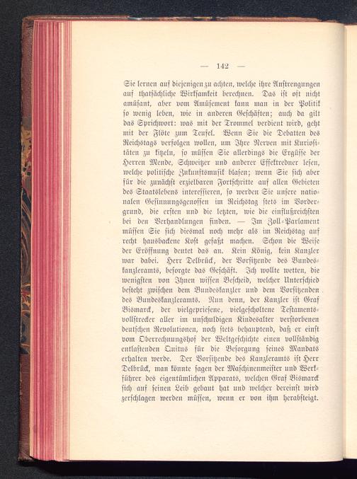 Sie lernen auf diejenigen zu achten, welche ihre Anstrengungenauf thatsächliche Wirksamkeit berechnen. Das ist ost nichtamüsant, aber vom Amüsement kann man in der Politikso wenig leben, wie in anderen Geschäften; auch da giltdas Sprichwort: was mit der Trommel verdient wird, gehtmit der Flöte zum Teufel. Wenn Sie die Debatten desReichstags verfolgen wollen, um Ihre Nerven mit Kuriosi-täten zu kitzelu, so müssen Sie allerdings die Ergüsse derHerren Mende, Schweitzer und anderer Effektredner lesen,welche politische Zutunftsmnsik blasen; wenn Sie sich aberfür die zunächst erzielbaren Fortschritte aus allen Gebietendes Staatslebens interessieren, so werden Sie unsere natio-nalen Gesinnungsgenossen im Reichstag stets im Vorder-grund, die ersten und die letzten, wie die einflußreichstenbei den Verhandlungen finden. — Im Zoll-Parlamentmüssen Sie sich diesmal noch mehr als im Reichstag aufrecht hausbackene Kost gesaßt machen. Schon die Weiseder Eröffnung dentet das an. Kein König, kein Kanzlerwar dabei. Herr Delbrück , der Vorsitzende des Bundes-kanzleramts, besorgte das Geschäft. Ich wollte wetten, diewenigsten von Ihnen wissen Bescheid, welcher Unterschiedbesteht zwischen dem Bundeskanzler und dem Vorsitzendendes Bundeskanzleramts. Nun denn, der Kanzler ist GrafBismarck, der vielgepriesene, vielgescholtene Testaments-vollstrecker aller im unschuldigen Kindesalter verstorbenendeutschen Revolutionen, noch stets behauptend, daß er einstvom Oberrechuungshof der Weltgeschichte einen vollständigentlastenden Quitus für die Besorgung seines Mandatserhalten werde. Der Vorsitzende des Kanzleramts ist HerrDelbrück , man könnte sagen der Maschinenmeister und Werk-führer des eigentümlichen Apparats, welchen Graf Bismarcksich auf seineu Leib gebaut hat und welcher dereinst wirdzerschlagen werden müssen, wenn er von ihm herabsteigt.