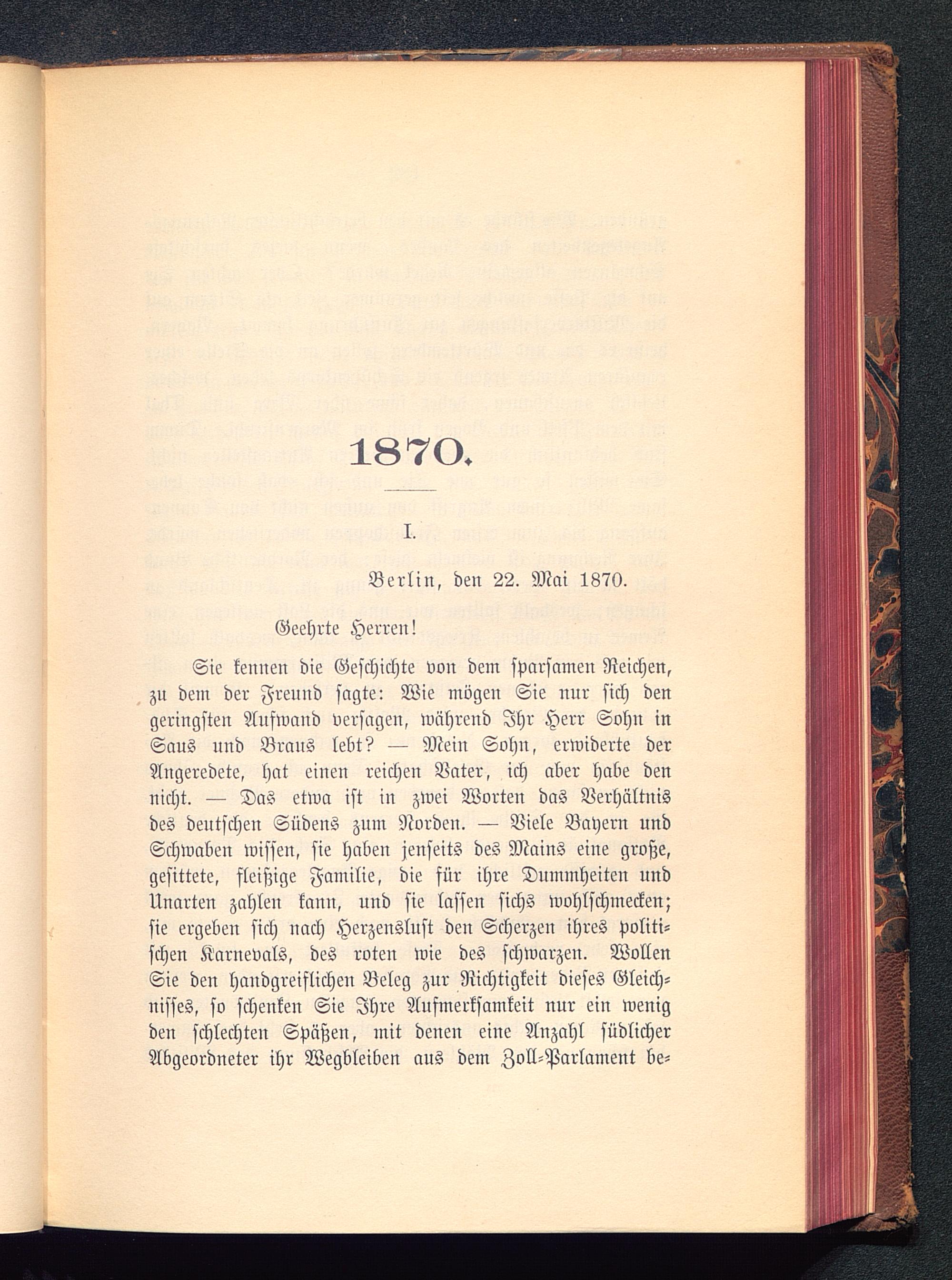 Sie kennen die Geschichte von dem sparsamen Reichen,zu dem der Freund sagte: Wie mögen Sie nur sich dengeringsten Aufwand versagen, während Ihr Herr Sohn inSaus und Brans lebt? — Mein Sohn, erwiderte derAngeredete, hat einen reichen Vater, ich aber habe dennicht. — Das etwa ist in zwei Worten das Verhältnisdes deutschen Südens zum Norden. — Viele Bayern undSchwaben wissen, sie haben jenseits des Mains eine große,gesittete, fleißige Familie, die für ihre Dummheiten undUnarten zahlen kann, und sie lassen sichs wohlschmecken;sie ergeben sich nach Herzenslust deu Scherzen ihres politi-schen Karnevals, des roten wie des schwarzen. WollenSie den handgreiflichen Beleg zur Richtigkeit dieses Gleich-nisses, so schenken Sie Ihre Aufmerksamkeit nur ein wenigden schlechten Späßen, mit denen eine Anzahl südlicherAbgeordneter ihr Wegbleiben aus dem Zoll-Parlament be-