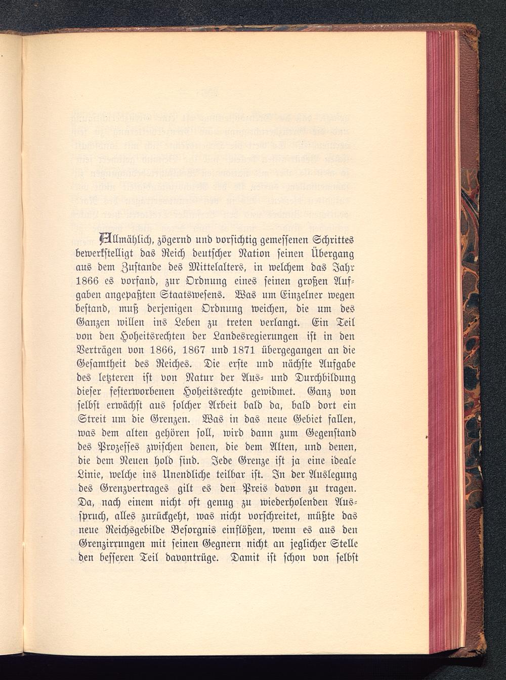 Allmählich, zögernd und vorsichtig gemessenen Schrittesbewerkstelligt das Reich deutscher Nation seinen Übergangaus dem Zustande des Mittelalters, in welchem das Jahr1866 es vorfand, zur Ordnung eines seinen großen Auf-gaben angepaßten Staatswesens. Was um Einzelner wegenbestand, muß derjenigen Ordnung weichen, die um desGanzen willen ins Leben zu treten verlangt. Ein Teilvon den Hoheitsrechten der Landesregierungen ist in denVerträgen von 1866, 1867 und 1871 übergegangen an dieGesamtheit des Reiches. Die erste und nächste Aufgabedes letzteren ist von Natur der Aus- und Durchbildungdieser festerworbenen Hoheitsrechte gewidmet. Ganz vonselbst erwächst aus solcher Arbeit bald da, bald dort einStreit um die Grenzen. Was in das neue Gebiet fallen,was dem alten gehören soll, wird dann zum Gegenstanddes Prozesses zwischen denen, die dem Alten, und denen,die dem Neuen hold sind. Jede Grenze ist ja eine idealeLinie, welche ins Unendliche teilbar ist. In der Auslegungdes Grenzvertrages gilt es den Preis davon zu tragen.Da, nach einem nicht oft genug zu wiederholenden Aus-spruch, alles zurückgeht, was nicht vorschreitet, müßte dasneue Reichsgebilde Besorgnis einflößen, wenn es aus deu Grenzirrungen mit seinen Gegnern nicht an jeglicher Stelleden besseren Teil davontrüge. Damit ist schon von selbst