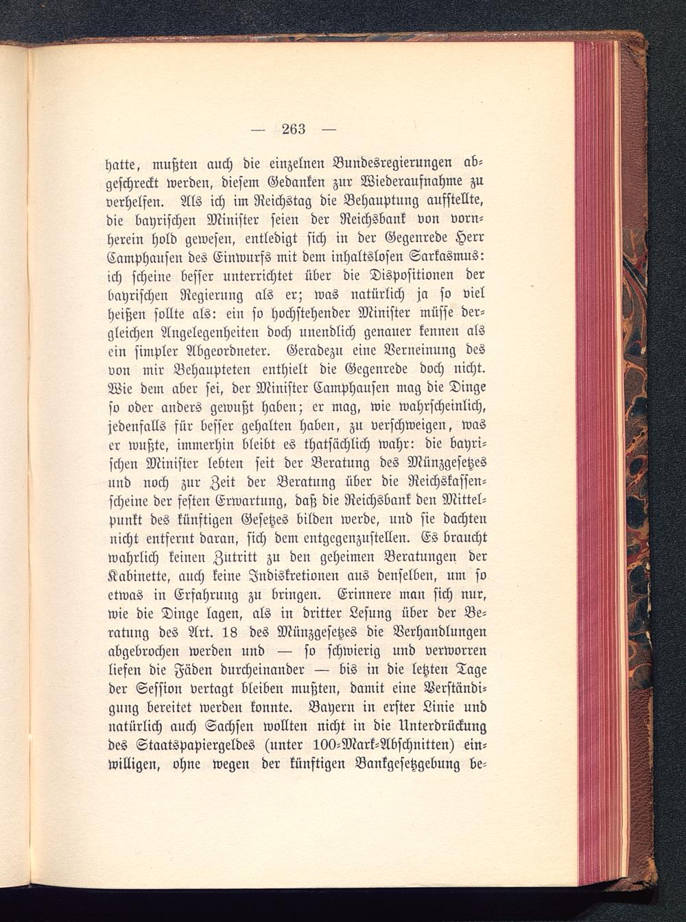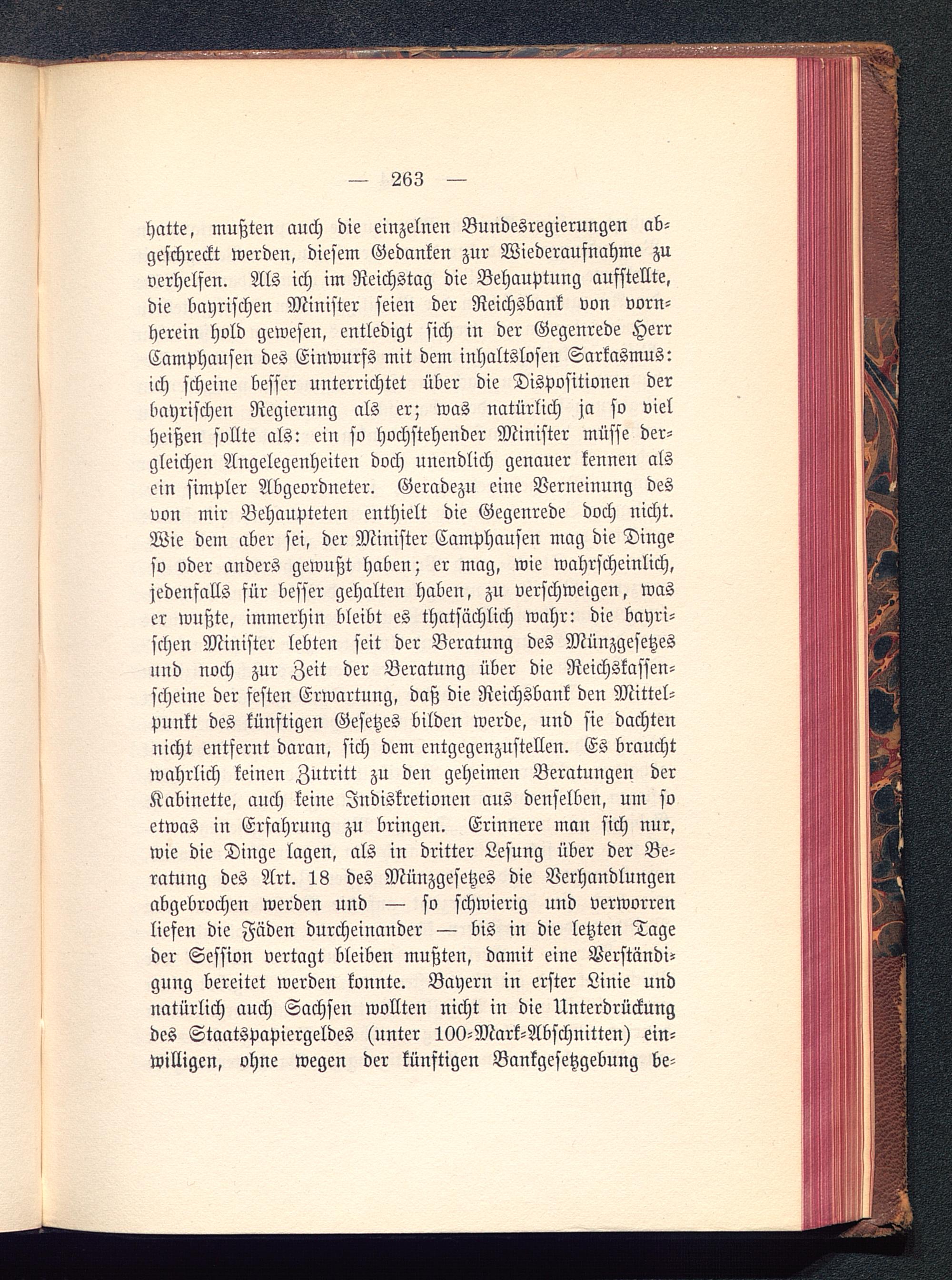 hatte, mußten auch die einzelnen Bundesregierungen ab-geschreckt werden, diesem Gedanken zur Wiederaufnahme zuverhelfen. Als ich im Reichstag die Behauptung aufstellte,die bayrischen Minister seien der Reichsbank von vorn-herein hold gewesen, entledigt sich in der Gegenrede HerrCamphausen des EinWurfs mit dem inhaltslosen Sarkasmus:ich scheine besser unterrichtet über die Dispositionen derbayrischen Regierung als er; was natürlich ja so vielheißen sollte als: ein so hochstehender Minister müsse der-gleichen Angelegenheiten doch unendlich genauer kennen alsein simpler Abgeordneter. Geradezu eine Verneinung desvon mir Behaupteten enthielt die Gegenrede doch nicht.Wie dem aber sei, der Minister Camphausen mag die Dingeso oder anders gewußt haben; er mag, wie wahrscheinlich,jedenfalls für besser gehalten haben, zu verschweigen, waser wußte, immerhin bleibt es thatsächlich wahr: die bayri-schen Minister lebten seit der Beratung des Münzgesetzesund noch zur Zeit der Beratung über die Reichskassen-scheine der festen Erwartung, daß die Reichsbank den Mittel-punkt des künftigen Gesetzes bilden werde, und sie dachtennicht entfernt daran, sich dem entgegenzustellen. Es brauchtwahrlich keinen Zutritt zu den geheimen Beratungen derKabinette, auch keine Indiskretionen aus denselben, um soetwas in Erfahrung zu bringen. Erinnere man sich nur,wie die Dinge lagen, als in dritter Lesung über der Be-ratung des Art. 18 des Münzgesetzes die Verhandlungenabgebrochen werden und — so schwierig und verworrenliefen die Fäden durcheinander — bis in die letzten Tageder Session vertagt bleiben mußten, damit eine Verständi-gung bereitet werden konnte. Bayern in erster Linie undnatürlich auch Sachsen wollten nicht in die Unterdrückungdes Staatspapiergeldes (unter 100-Mark-Abschnitten) ein-willigen, ohne wegen der künftigen Bankgesetzgebung be-