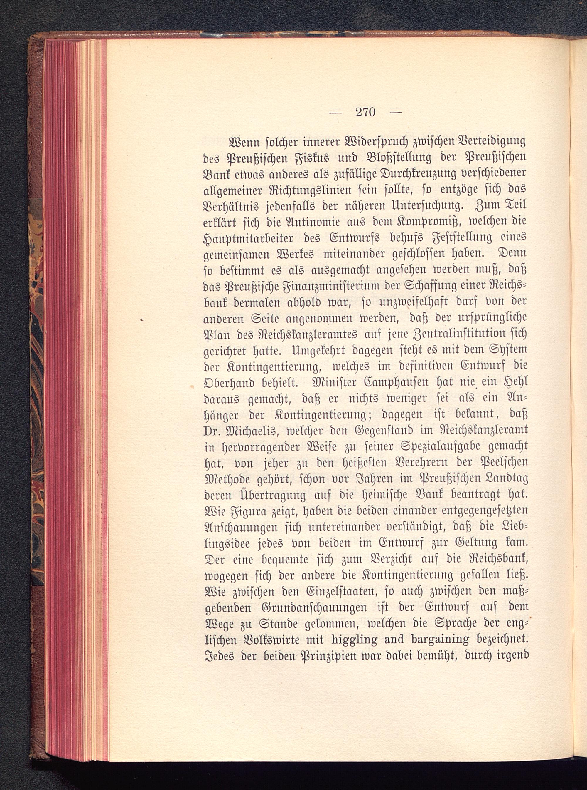 Wenn solcher innerer Widerspruch zwischen Verteidigungdes Preußischen Fiskus und Bloßstellung der Preußische»Bank etwas anderes als zufällige Durchkreuzung verschiedenerallgemeiner Richtungslinien sein sollte, so entzöge sich dasVerhältnis jedenfalls der näheren Untersuchung. Zum Teilerklärt sich die Antinomie aus dem Kompromiß, welchen dieHauptmitarbeiter des Entwurfs behufs Feststellung einesgemeinsamen Werkes miteinander geschlossen haben. Dennso bestimmt es als ausgemacht angesehen werden muß, daßdas Preußische Finanzministerium der Schaffung einer Reichs-bank dermalen abhold war, so unzweifelhaft darf von deranderen Seite angenommen werden, daß der ursprünglichePlan des Reichskauzleramtes auf jene Zentralinstitution sichgerichtet hatte. Umgekehrt dagegen steht es mit dem Systemder Kontingentierung, welches im definitiven Entwurf dieOberhand behielt. Minister Camphausen hat nie ein Hehldaraus gemacht, daß er nichts weniger sei als ein An-hänger der Kontingentierung; dagegen ist bekannt, daßDr. Michaelis, welcher den Gegenstand im Reichskanzleramtin hervorragender Weise zu seiuer Spezialaufgabe gemachthat, von jeher zu den heißesten Verehrern der PeelschenMethode gehört, schon vor Jahren im Preußischen Landtagderen Übertragung auf die heimische Bank beantragt hat.Wie Figura zeigt, haben die beiden einander entgegengesetztenAnschauungen sich untereinander verständigt, daß die Lieb-lingsidee jedes von beiden im Entwurf zur Geltung kam.Der eine bequemte sich zum Verzicht auf die Reichsbank,wogegen sich der andere die Kontingentierung gefallen ließ.Wie zwischen den Einzelstaaten, so auch zwischen den maß-gebenden Grundanschauungen ist der Entwurf auf demWege zu Stande gekommen, welchen die Sprache der eng-lischen Volkswirte mit ni^Alin^ anci bar^ainiu^ bezeichnet.Jedes der beiden Prinzipien war dabei bemüht, durch irgend