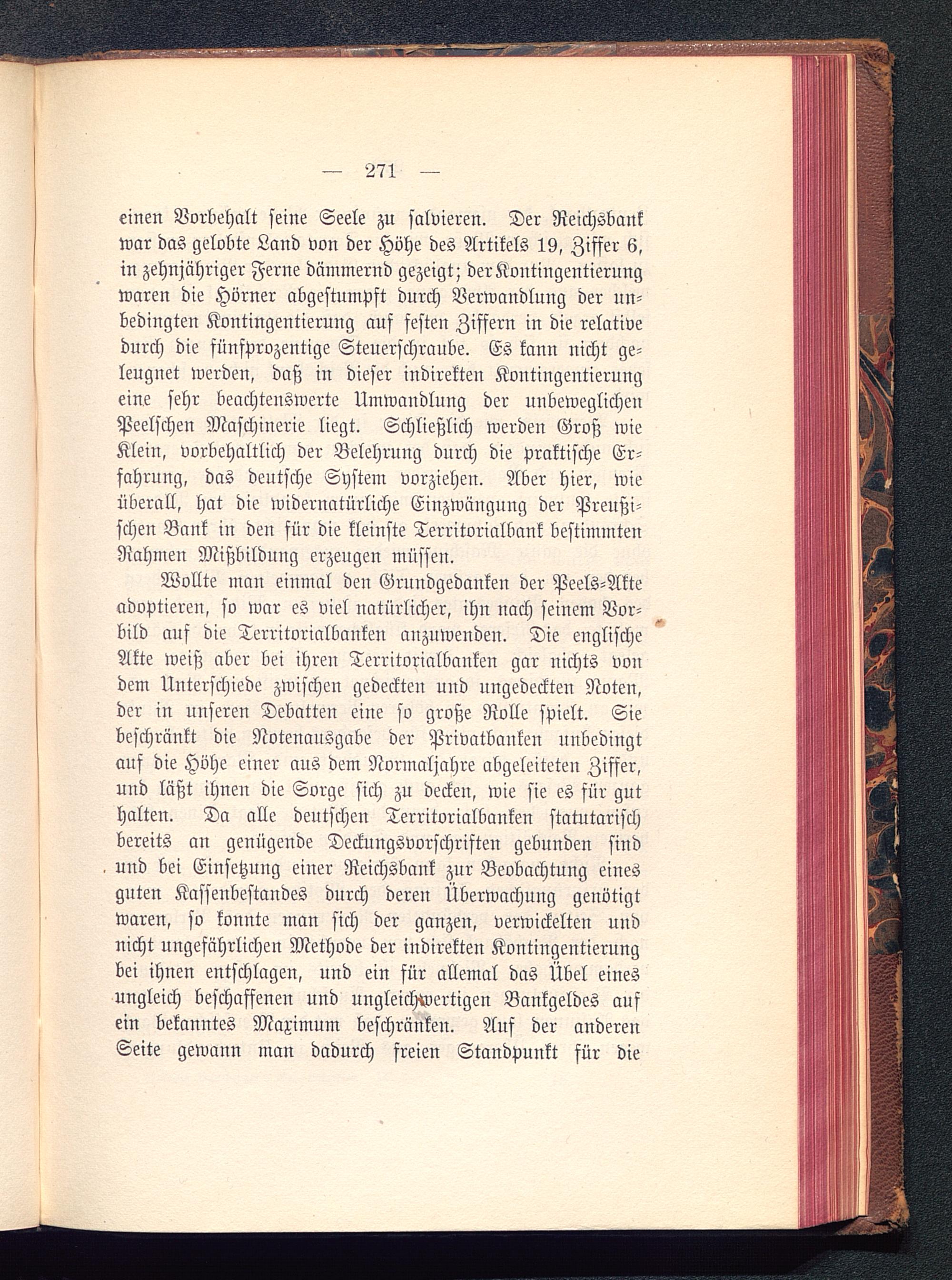 Wollte man einmal den Grundgedanken der Peels-Akteadoptieren, so war es viel natürlicher, ihn nach seinem Vor-bild auf die Territorialbanken anzuwenden. Die englischeAkte weiß aber bei ihren Territorialbanken gar nichts vondem Unterschiede zwischen gedeckten und ungedeckten Noten,der in unseren Debatten eine so große Rolle spielt. Siebeschränkt die Notenausgabe der Privatbanken unbedingtauf die Höhe einer aus dem Normaljahre abgeleiteten Ziffer,uud läßt ihnen die Sorge sich zu decken, wie sie es für guthalten. Da alle deutschen Territorialbanken statutarischbereits an genügende Deckungsvorschriften gebunden sindund bei Einsetzung einer Reichsbank zur Beobachtung einesguten Kassenbestandes durch deren Überwachung geuötigtwaren, so konnte man sich der ganzen, verwickelten undnicht ungefährlichen Methode der indirekten Kontingentierungbei ihnen entschlagen, und ein für allemal das Übel einesungleich beschaffenen und ungleichwertigen Bankgeldes aufein bekanntes Maximum beschränken. Auf der anderenSeite gewann man dadurch freien Standpuukt für die
