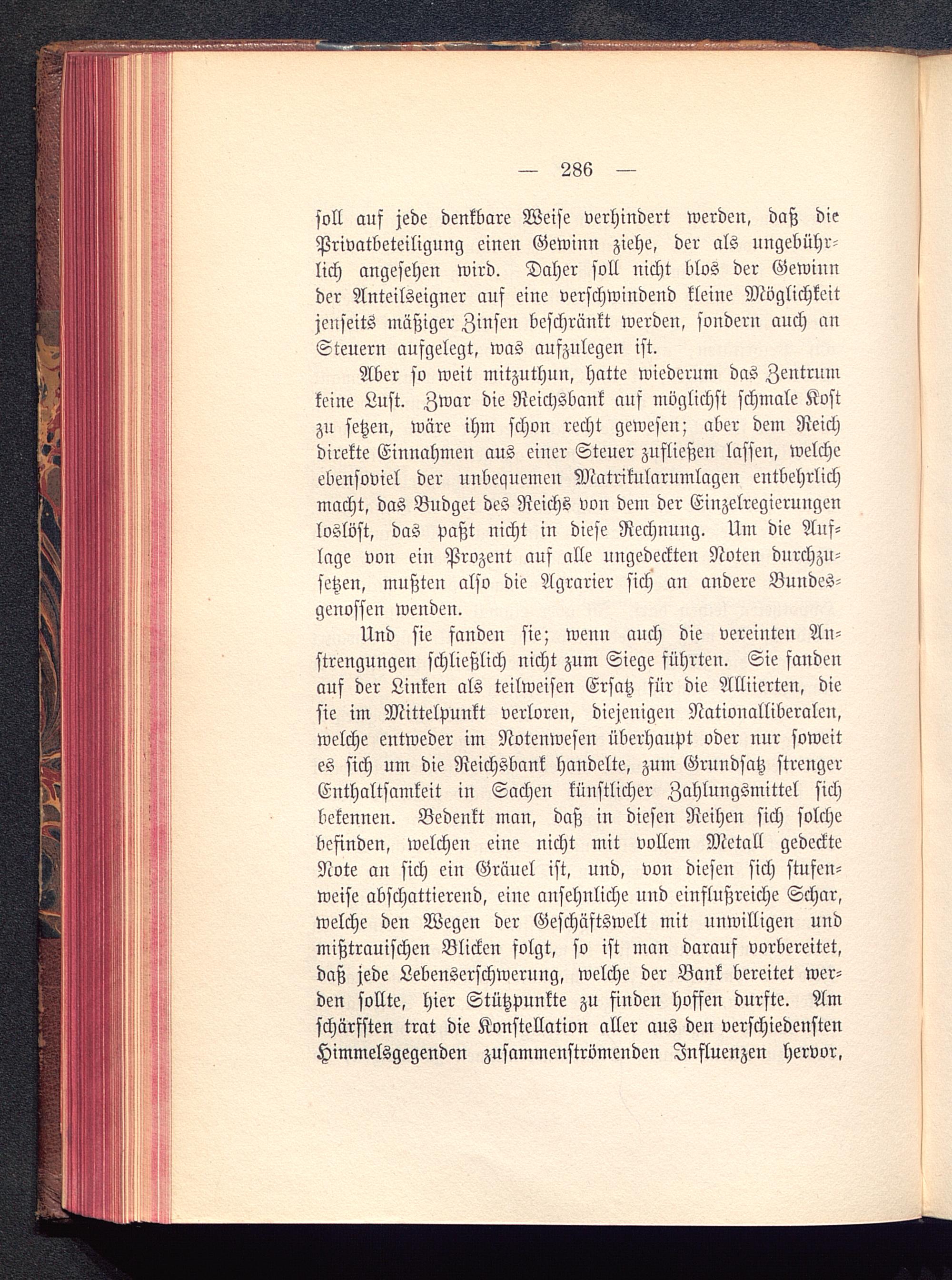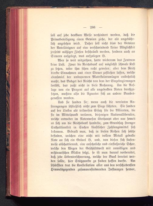 Und sie fanden sie; wenn auch die vereinten An-strengungen schließlich nicht zum Siege führten. Sie fandenauf der Linken als teilweisen Ersatz für die Alliierten, diesie im Mittelpunkt verloren, diejenigen Nationalliberalen,welche entweder im Notenwesen überhaupt oder nur soweites sich um die Reichsbank handelte, zum Grundsatz strengerEnthaltsamkeit in Sachen künstlicher Zahlungsmittel sichbekennen. Bedenkt man, daß in diesen Reihen sich solchebefinden, welchen eine nicht mit vollem Metall gedeckteNote an sich ein Grüuel ist, und, von diesen sich stufen-weise abschattierend, eine ansehnliche und einflußreiche Schar,welche den Wegen der Geschäftswelt mit unwilligen undmißtrauischen Blicken folgt, so ist man darauf vorbereitet,daß jede Lebenserschwerung, welche der Bank bereitet wer-den sollte, hier Stützpunkte zu finden hoffen durfte. Amschärfsten trat die Konstellation aller aus den verschiedenstenHimmelsgegenden zusammenströmenden Influenzen hervor,