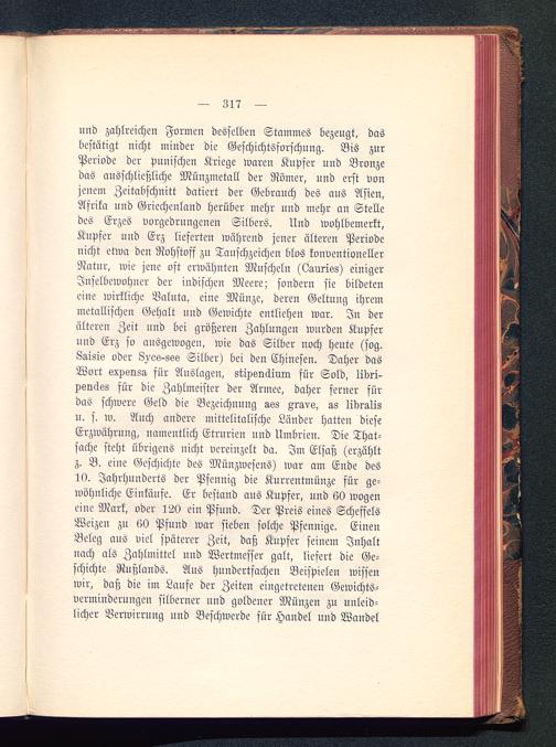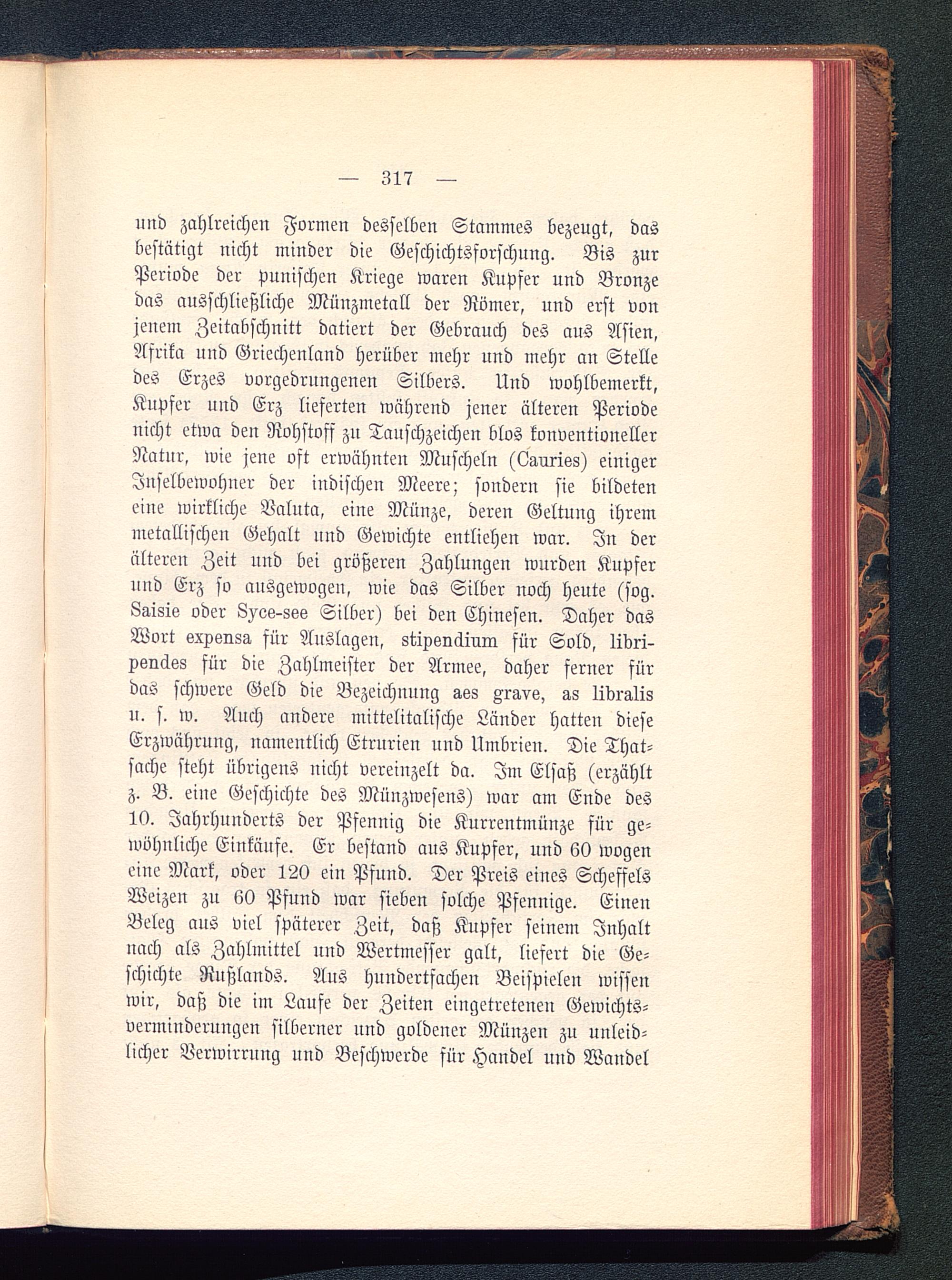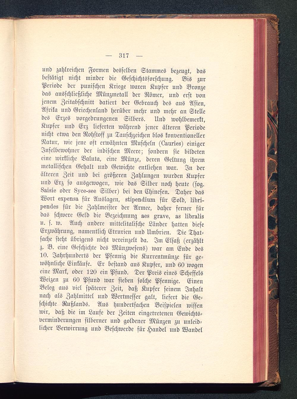 und zahlreichen Formen desselben Stammes bezeugt, dasbestätigt nicht minder die Geschichtsforschung. Bis zurPeriode der punischen Kriege waren Kupfer und Bronzedas ausschließliche Münzmetall der Römer , und erst vonjenem Zeitabschnitt datiert der Gebrauch des aus Asien ,Afrika und Griechenland herüber mehr und mehr an Stelledes Erzes vorgedrungenen Silbers. Und wohlbemerkt,Kupfer und Erz lieferten wahrend jener älteren Periodenicht etwa den Rohstoff zn Tauschzeichen blos konventionellerNatur, wie jene oft erwähnten Muscheln (Lauriks) einigerInselbewohner der indischen Meere; sondern sie bildeteneine wirkliche Valuta, eine Münze, deren Geltung ihremmetallischen Gehalt und Gewichte entlichen war. In deralteren Zeit und bei größeren Zahlungen wurden Kupferund Erz so ausgewogen, wie das Silber noch heute (sog.8g,isis oder L^os-ssö Silber) bei den Chinesen. Daher dasWort exv6ns3, für Auslagen, stipknäiuin für Sold, livri-xsnäss für die Zahlmeister der Armee, daher ferner fürdas schwere Geld die Bezeichnung ass Aravs, lidrglisu. s. w. Auch andere mittelitalische Länder hatten dieseErzWährung, namentlich Etrurien und Umbrien. Die That-sache steht übrigens nicht vereinzelt da. Im Elsaß (erzähltz. B. eine Geschichte des Münzwesens) war am Ende des19. Jahrhunderts der Pfennig die Kurrentmünze für ge-wöhnliche Einkäufe. Er bestand aus Kupfer, und 60 wogeneine Mark, oder 120 ein Pfund. Der Preis eines ScheffelsWeizen zu 60 Pfund war sieben solche Pfennige. EinenBeleg aus viel späterer Zeit, daß Kupfer seinem Inhaltnach als Zahlmittel und Wertmesser galt, liefert die Ge-schichte Rußlands . Aus hundertfachen Beispielen wissenwir, daß die im Laufe der Zeiten eingetretenen Gewichts-verminderungen silberner und goldener Münzen zu unleid-licher Verwirrung und Beschwerde für Handel und Wandel