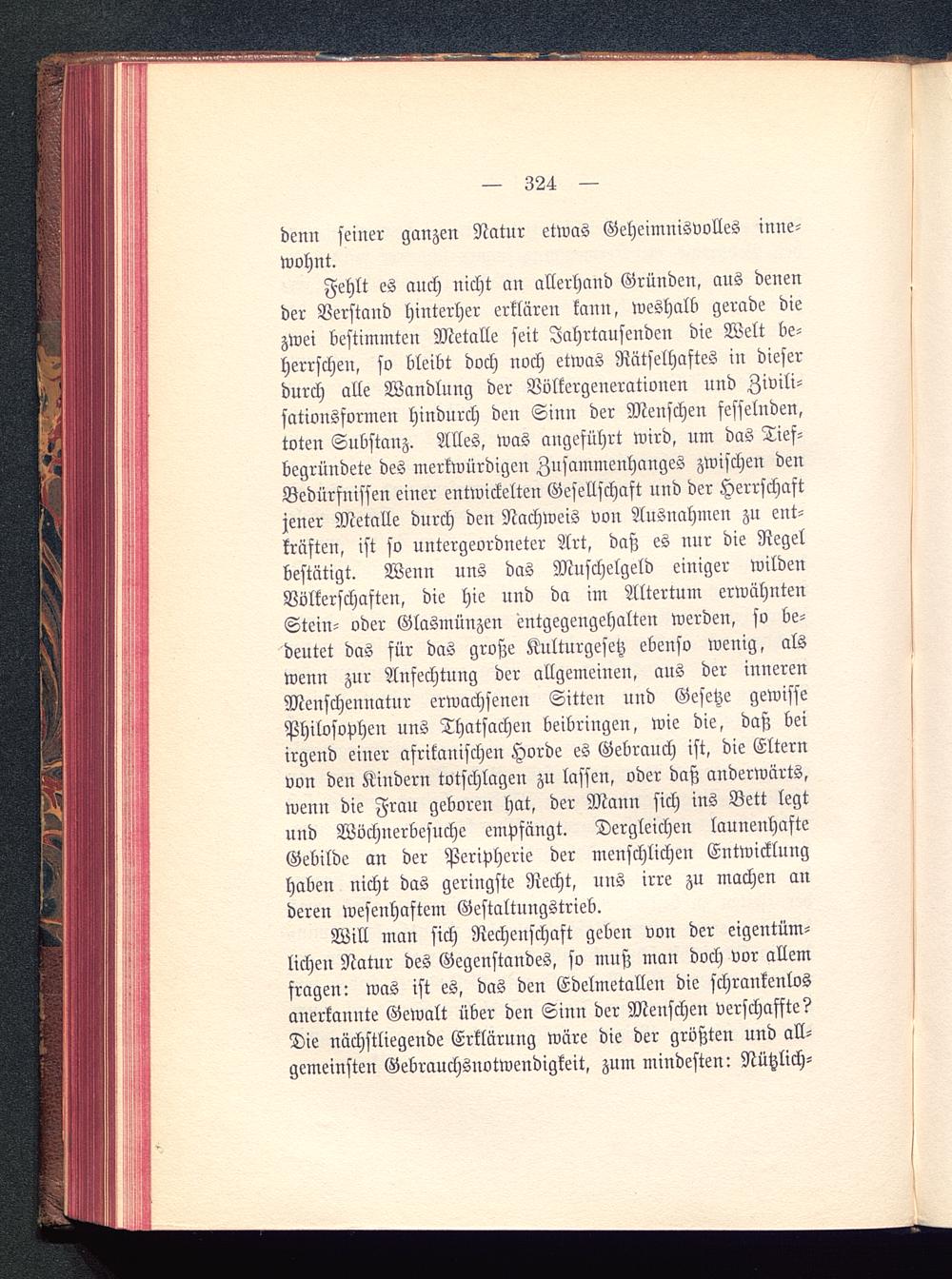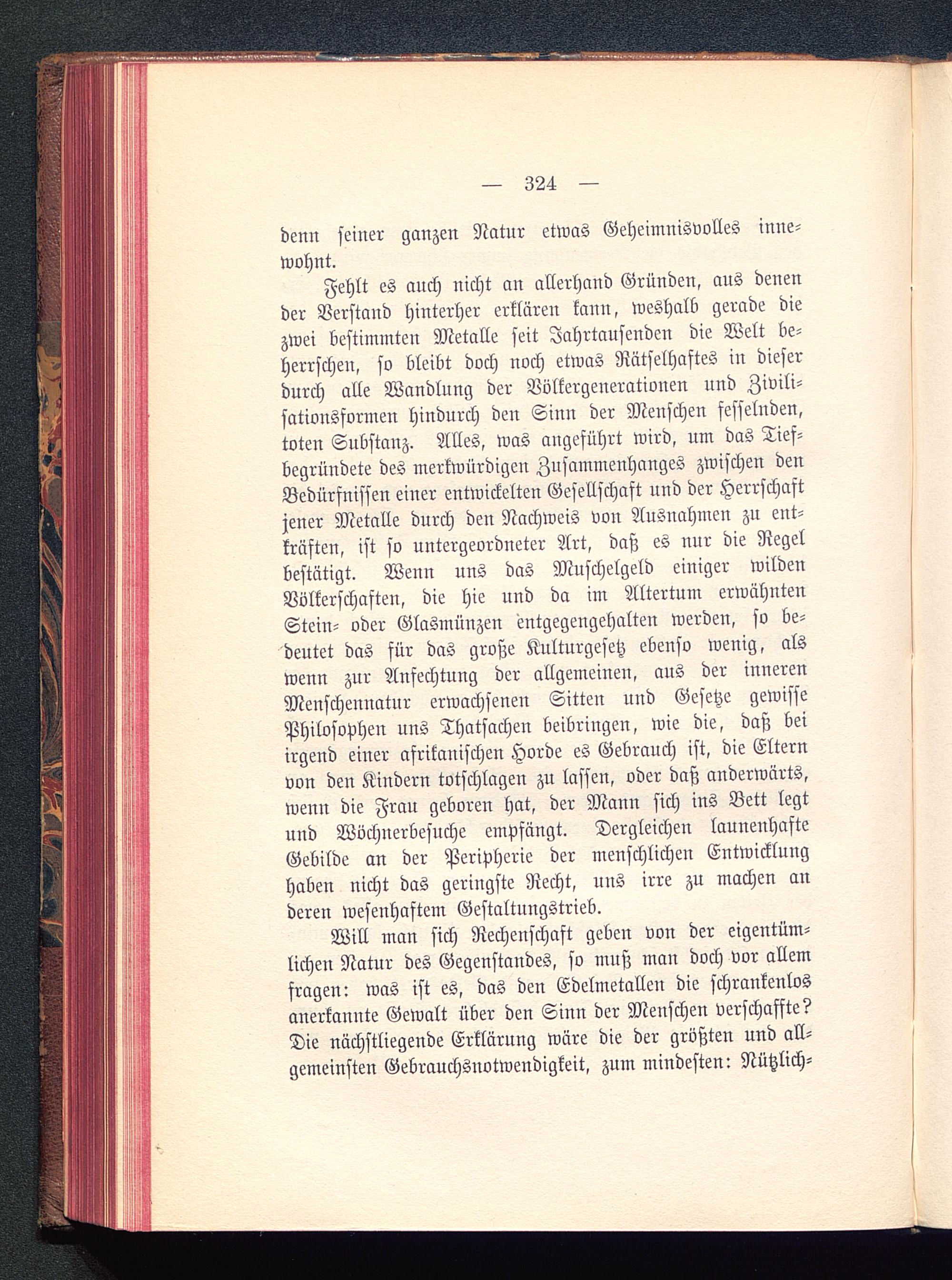 Fehlt es auch nicht an allerhand Gründen, aus deuender Verstand hinterher erklären kann, weshalb gerade diezwei bestimmten Metalle seit Jahrtausenden die Welt be-herrschen, so bleibt doch noch etwas Rätselhaftes in dieserdurch alle Wandlung der Völkergenerativnen und Zivili-sationsformen hindurch den Sinn der Menschen fesselnden,toten Substanz. Alles, was angeführt wird, um das Tief-begründete des merkwürdigen Zusammenhanges zwischen denBedürfnissen einer entwickelten Gesellschaft und der Herrschaftjener Metalle durch den Nachweis von Ausnahmen zu ent-kräften, ist so untergeordneter Art, daß es nur die Regelbestätigt. Wenn uns das Muschelgeld einiger wildenVölkerschaften, die hie und da im Altertum erwähntenStein- oder Glasmünzen entgegengehalten werden, so be-deutet das für das große Kulturgesetz ebenso wenig, alswenn zur Anfechtung der allgemeinen, ans der innerenMenschennatur erwachsenen Sitten uud Gesetze gewissePhilosophen uns Thatsachen beibringen, wie die, daß beiirgend einer afrikanischen Horde es Gebrauch ist, die Elternvon den Kindern totschlagen zu lassen, oder daß anderwärts,wenn die Fran geboren hat, der Mann sich ins Bett legtund Wöchnerbesuche empfängt. Dergleichen launenhafteGebilde an der Peripherie der menschlichen Entwicklunghaben nicht das geringste Recht, uns irre zu machen anderen wesenhaftem Gestaltungstrieb.