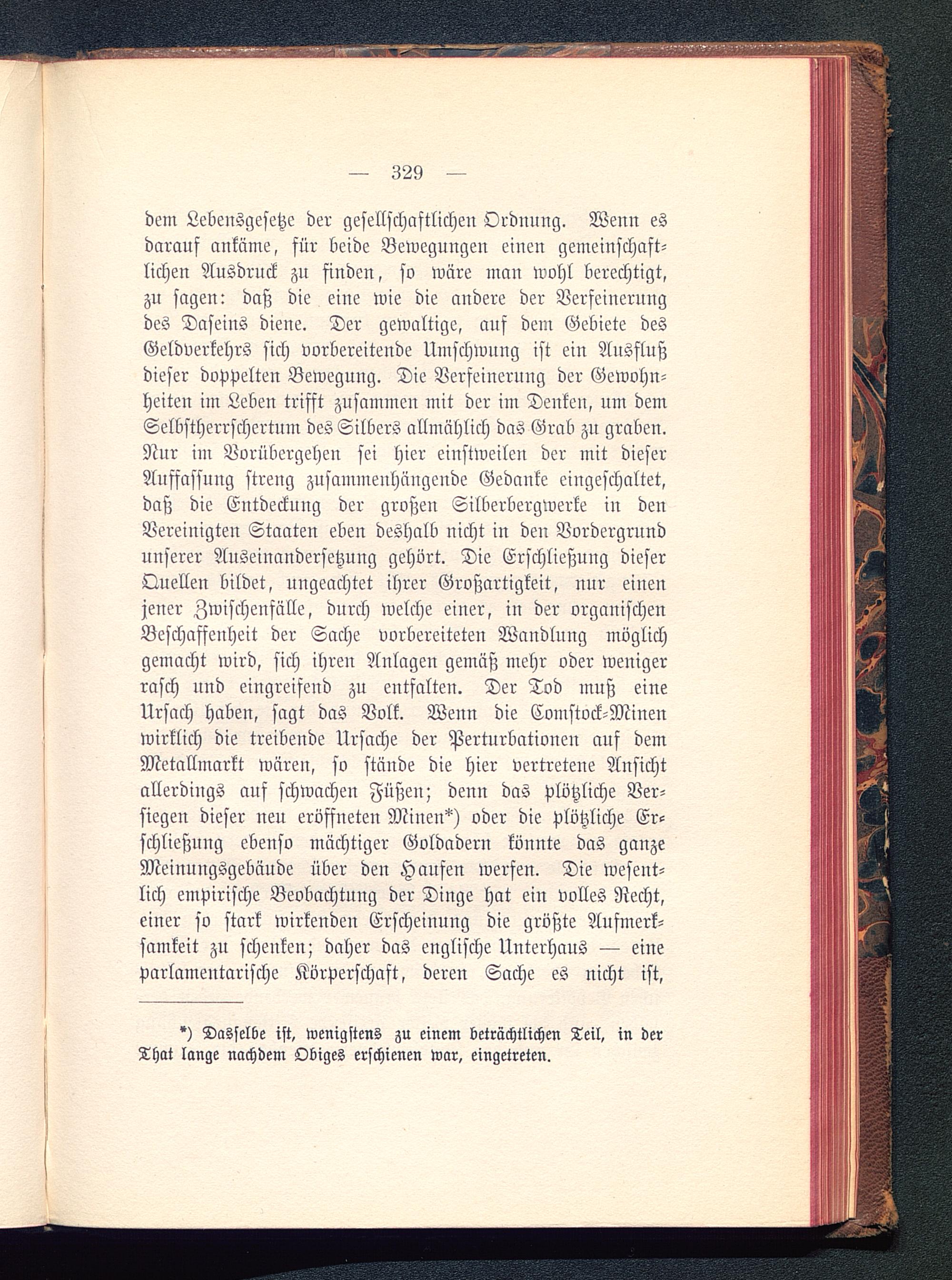 dem Lebensgesetze der gesellschaftlichen Ordnung. Wenn esdarauf ankäme, für beide Bewegungen einen gemeinschaft-lichen Ausdruck zu finden, so wäre man Wohl berechtigt,zu sagen: daß die eine wie die andere der Verfeinerungdes Daseins diene. Der gewaltige, auf dem Gebiete desGeldverkehrs sich vorbereitende Umschwung ist ein Ausflußdieser doppelten Bewegung. Die Verfeinerung der Gewohn-heiten im Leben trifft zusammen mit der im Denken, um demSelbstherrschertum des Silbers allmählich das Grab zu graben.Nur im Vorübergehen sei hier einstweilen der mit dieserAuffassung streng zusammenhängende Gedanke eingeschaltet,daß die Entdeckung der großen Silberbergwerke in denVereinigten Staaten eben deshalb nicht in den Vordergrundunserer Auseinandersetzung gehört. Die Erschließung dieserQuellen bildet, ungeachtet ihrer Großartigkeit, nur einenjener Zwischenfälle, durch welche einer, in der organischenBeschaffenheit der Sache vorbereiteten Wandlung möglichgemacht wird, sich ihren Anlagen gemäß mehr oder wenigerrasch und eingreifend zu entfalten. Der Tod muß eineUrsach haben, sagt das Volk. Wenn die Comstock-Minenwirklich die treibende Ursache der Perturbationeu auf demMetallmarkt wären, so stände die hier vertretene Ansichtallerdings auf schwachen Füßen; denn das plötzliche Ver-siegen dieser neu eröffneten Minen*) oder die plötzliche Er-schließung ebenso mächtiger Goldadern könnte das ganzeMeinungsgebäude über den Haufen werfen. Die wesent-lich empirische Beobachtung der Dinge hat ein volles Recht,einer so stark wirkenden Erscheinung die größte Aufmerk-samkeit zu schenken; daher das englische Unterhaus — eiueparlamentarische Körperschaft, deren Sache es nicht ist,