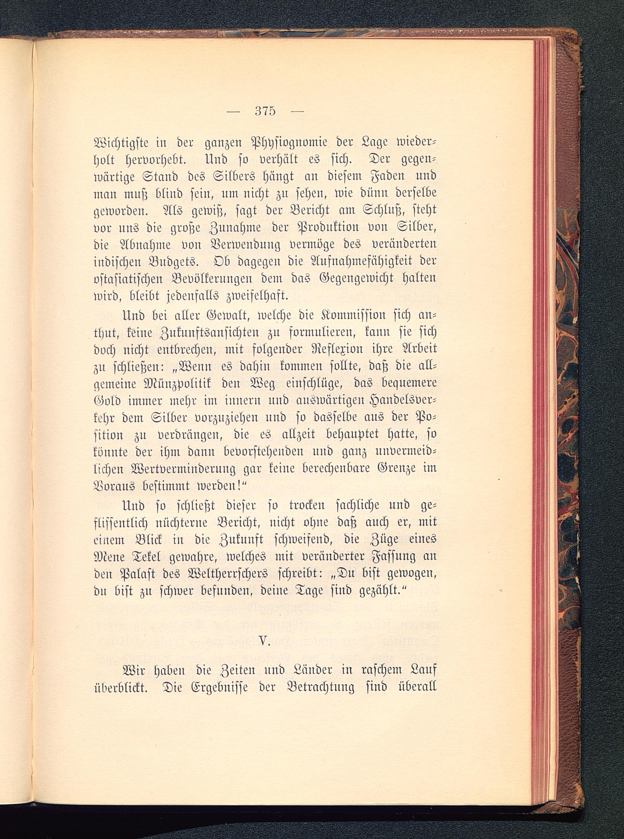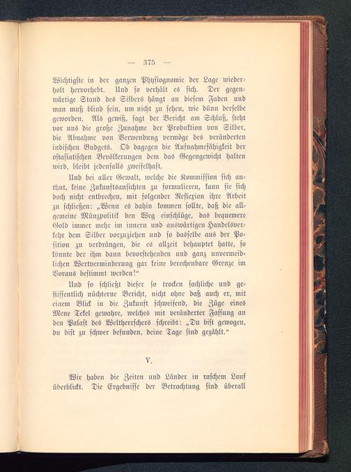 Und bei aller Gewalt, welche die Kommission sich an-thut, keine Zuknnftsansichten zu formulieren, kann sie sichdoch nicht entbrechen, mit folgender Reflexion ihre Arbeitzu schließen: „Wenn es dahin kommen sollte, daß die all-gemeine Münzpolitik den Weg einschlüge, das bequemereGold immer mehr im innern und auswärtigen Handelsver-kehr dem Silber vorzuziehen und so dasselbe aus der Po-sition zu verdrängen, die es allzeit behauptet hatte, sokönnte der ihm dann bevorstehenden nnd ganz uuvermeid-licheu Wertvermiuderuug gar keiue berechenbare Grenze imBoraus bestimmt werden!"
