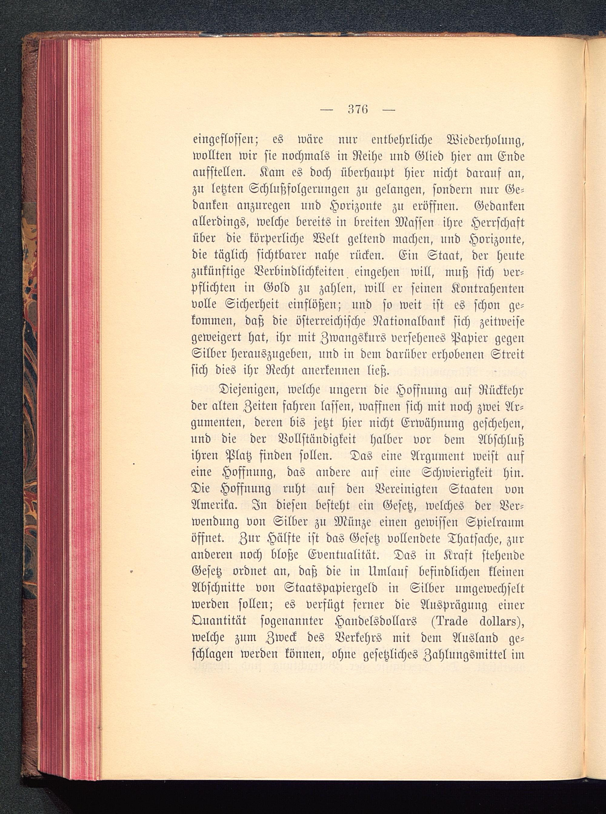eingeflossen; es wäre nur entbehrliche Wiederholung,wollten wir sie nochmals in Reihe und Glied hier am Endeaufstellen. Kam es doch überhaupt hier nicht darauf an,zu letzten Schlußfolgerungen zu gelangen, sondern nnr Ge-danken anzuregen und Horizonte zn eröffnen. Gedankenallerdings, welche bereits in breiten Massen ihre Herrschaftüber die körperliche Welt geltend machen, und Horizonte,die täglich sichtbarer nahe rücken. Ein Staat, der heutezukünftige Verbindlichkeiten eingehen will, muß sich ver-pflichten in Gold zu zahlen, will er seinen Kontrahentenvolle Sicherheit einflößen; und so weit ist es schon ge-kommen, daß die österreichische Nationalbank sich zeitweisegeweigert hat, ihr mit Zwangskurs versehenes Papier gegenSilber herauszugeben, und in dem darüber erhobenen Streitsich dies ihr Recht anerkennen ließ.
