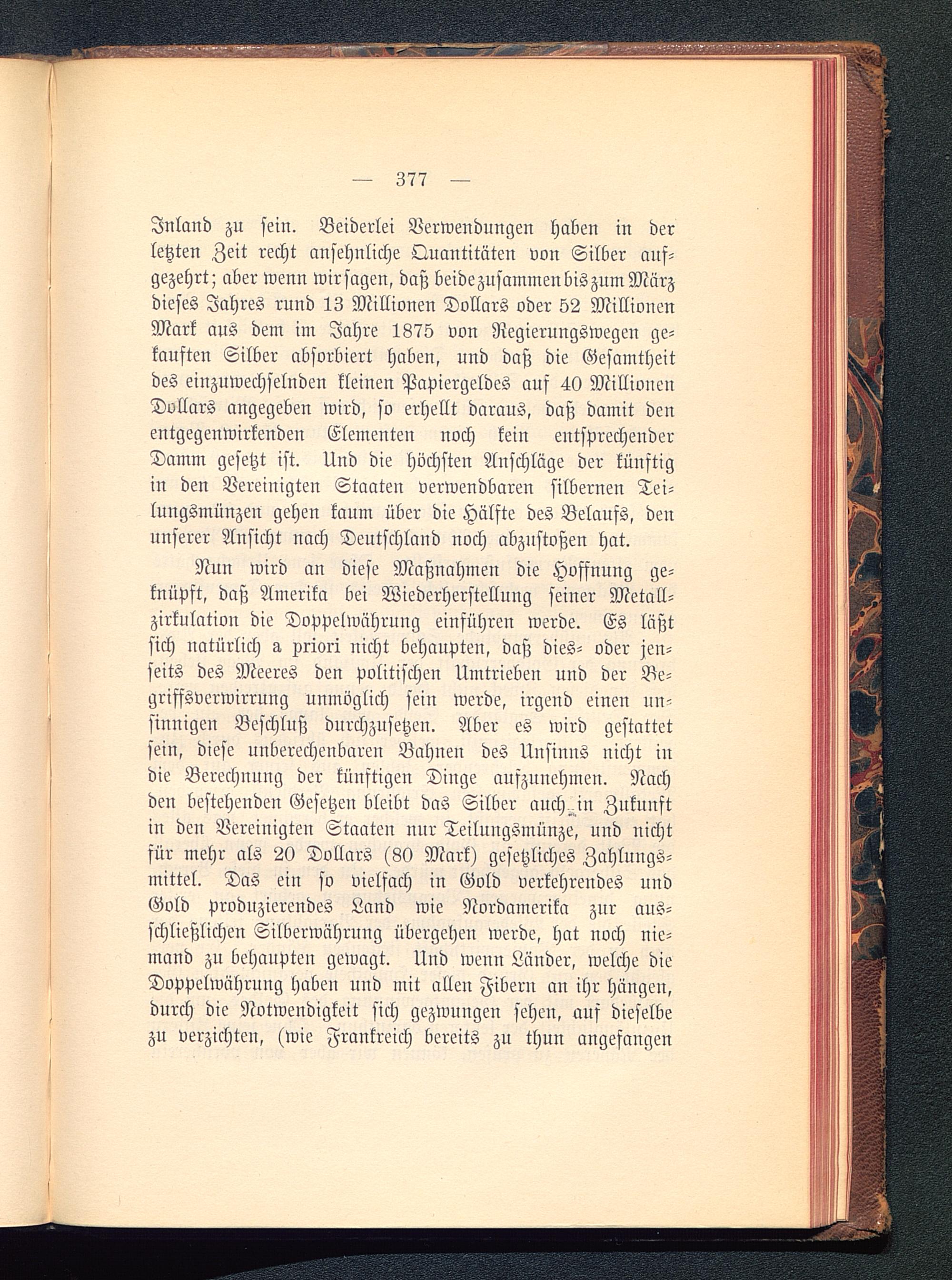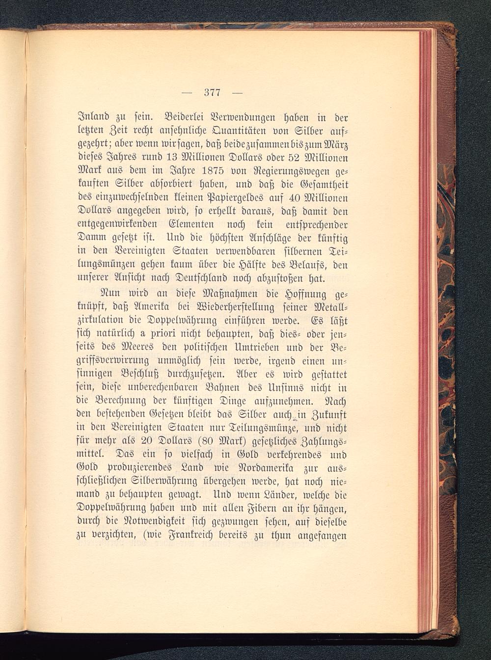Inland zu sein. Beiderlei Verwendungen haben in derletzten Zeit recht ansehnliche Quantitäten von Silber auf-gezehrt; aber wenn wirsagen, daß beidezusammeubiszumMärzdieses Jahres rund 13 Millionen Dollars oder 52 MillionenMark aus dem im Jahre 1875 von Regierungswegen ge-kauften Silber absorbiert haben, und daß die Gesamtheitdes einzuwechselnden kleinen Papiergeldes auf 40 MillionenDollars angegeben wird, so erhellt daraus, daß damit denentgegenwirkenden Elementen noch kein entsprechenderDamm gesetzt ist. Und die höchsten Anschläge der künftigin den Vereinigten Staaten verwendbaren silbernen Tei-lungsmünzen gehen kaum über die Hälfte des Belaufs, denunserer Ausicht nach Deutschland noch abzustoßen hat.