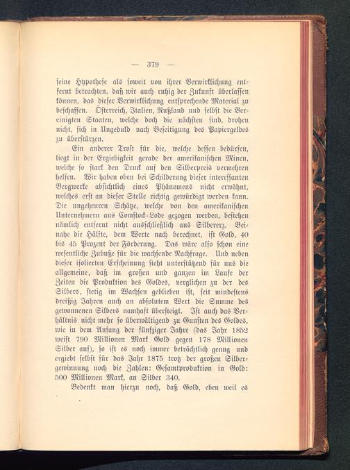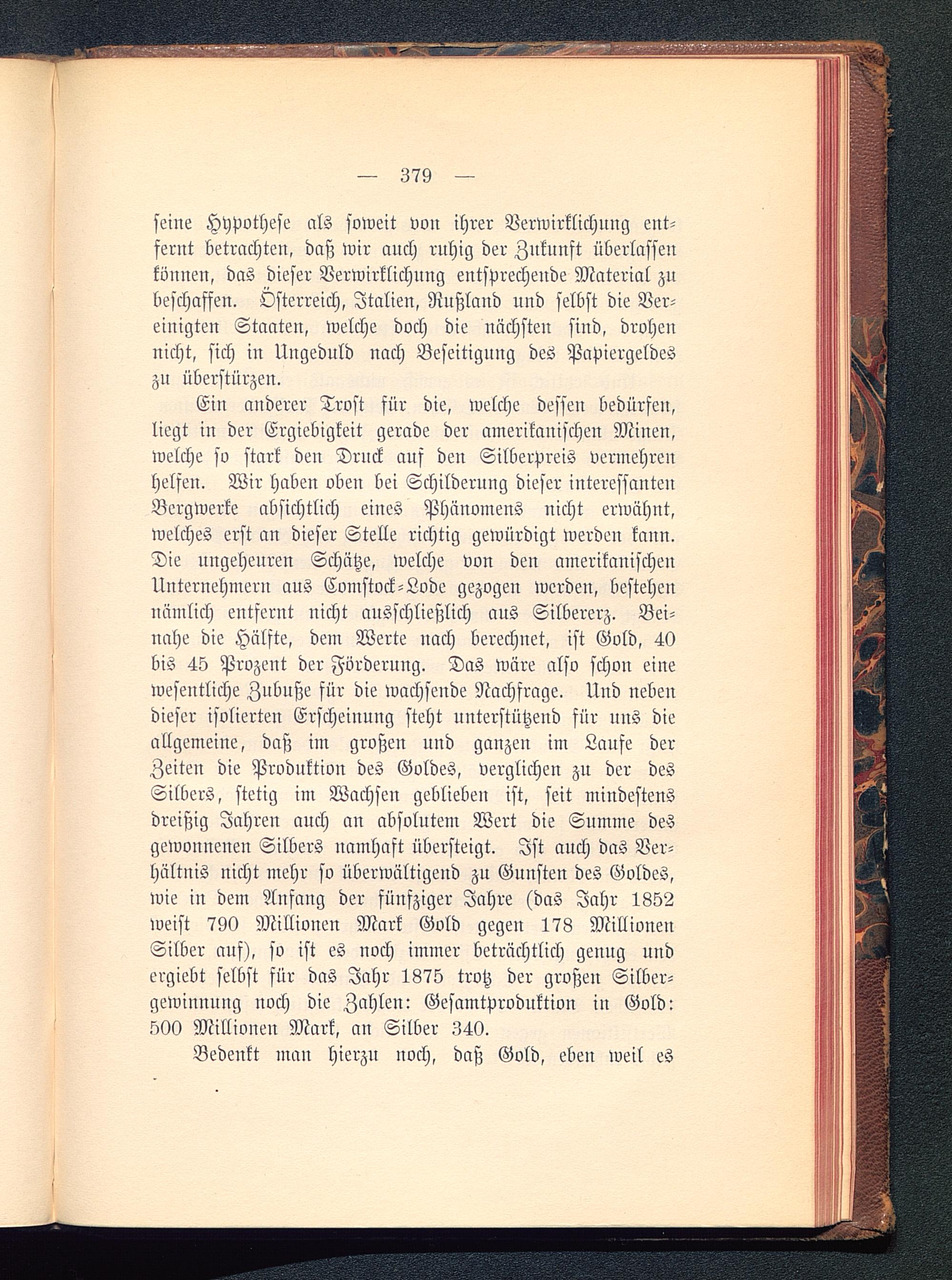 Ein anderer Trost für die, welche dessen bedürfe»,liegt in der Ergiebigkeit gerade der amerikanischen Minen,welche so stark den Druck ans den Silberpreis vermehrenhelfen. Wir haben oben bei Schilderung dieser interessantenBergwerke absichtlich eiues Phänomens nicht erwähnt,welches erst an dieser Stelle richtig gewürdigt werden kann.Die ungeheuren Schätze, welche von den amerikanischen Unternehmern aus Comstock-Lode gezogen werden, bestehennämlich entfernt nicht ausschließlich aus Silbererz. Bei-nahe die Hälfte, dem Werte nach berechnet, ist Gold, 40bis 45 Prozent der Förderung. Das wäre also schon einewesentliche Zubuße für die wachseude Nachfrage. Und nebendieser isolierten Erscheinung steht unterstützend für nus dieallgemeine, daß im großen und ganzen im Laufe derZeiten die Produktion des Goldes, verglichen zu der desSilbers, stetig im Wachsen geblieben ist, seit mindestensdreißig Jahren auch an absolutem Wert die Summe desgewonnenen Silbers namhaft übersteigt. Ist auch das Ver-hältnis nicht mehr so überwältigend zu Gnnsten des Goldes,wie in dem Anfang der fünfziger Jahre (das Jahr 1852weist 790 Millionen Mark Gold gegen 178 MillionenSilber auf), so ist es noch immer beträchtlich genug undergiebt selbst für das Jahr 1875 trotz der großen Silber-gewinnnng noch die Zahlen: Gesamtproduktion in Gold :500 Millionen Mark, an Silber 340.
