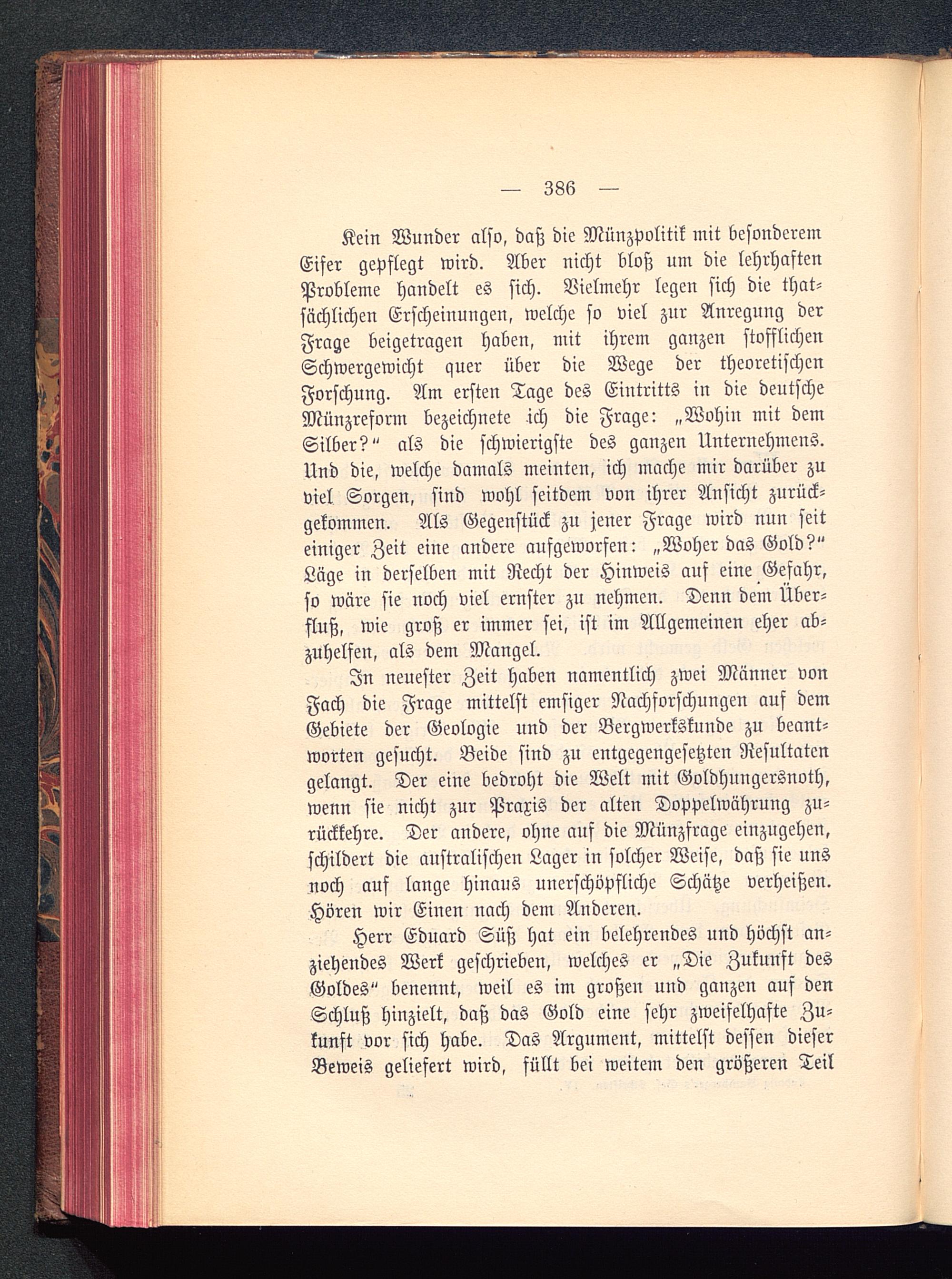 Herr Eduard Süß hat ein belehrendes und höchst an-ziehendes Werk geschrieben, welches er „Die Zukunft desGoldes" benennt, weil es im großen und ganzen auf denSchluß hinzielt, daß das Gold eine sehr zweifelhafte Zu-kunft vor sich habe. Das Argument, mittelst dessen dieserBeweis geliefert wird, füllt bei weitem den größeren Teil