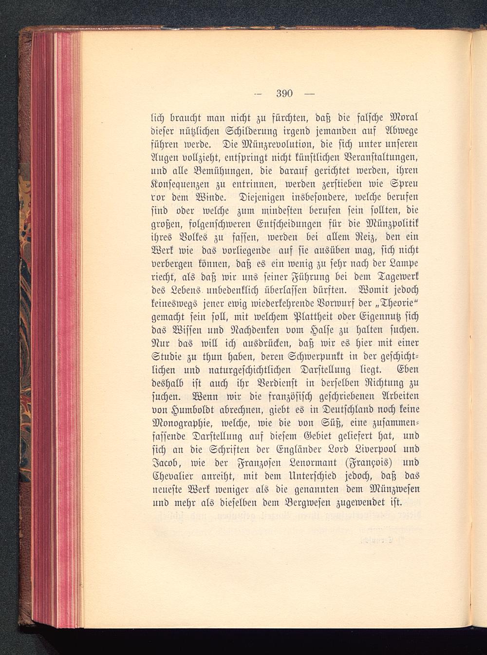 lich braucht man nicht zu fürchten, daß die falsche Moraldieser nützlichen Schilderung irgend jemanden auf Abwegeführen werde. Die Münzrevolution, die sich unter unserenAugen vollzieht, entspringt nicht künstlichen Veranstaltungen,und alle Bemühnngen, die darauf gerichtet werden, ihrenKonsequenzen zu entrinnen, werden zerstieben wie Spreuvor dem Winde. Diejenigen insbesondere, welche berufensind oder welche zum mindesten berufen sein sollten, diegroßen, folgenschweren Entscheidungen für die Münzpolitikihres Volkes zu fassen, werden bei allem Reiz, den einWerk wie das vorliegende auf sie ausüben mag, sich nichtverbergen können, daß es ein wenig zu sehr nach der Lampe riecht, als das; wir nns seiner Führung bei dem Tagewerkdes Lebens unbedenklich überlassen dürften. Womit jedochkeineswegs jener ewig wiederkehrende Vorwurf der „Theorie"gemacht sein soll, mit welchem Plattheit oder Eigennutz sichdas Wissen und Nachdenken vom Halse zu halten suchen.Nur das will ich ausdrücken, daß wir es hier mit einerStudie zu thun haben, deren Schwerpunkt in der geschicht-lichen und naturgeschichtlichen Darstellung liegt. Ebendeshalb ist auch ihr Verdienst in derselben Richtung zusuchen. Wenn wir die französisch geschriebenen Arbeitenvon Humboldt abrechnen, giebt es in Deutschland noch keineMonographie, welche, wie die von Süß, eine zusammen-fassende Darstellung ans diesem Gebiet geliefert hat, undsich an die Schriften der Engländer Lord Liverpool undJacob, wie der Franzosen Lenormant (Fran?ois) undChevalier anreiht, mit dem Unterschied jedoch, daß dasneneste Werk weniger als die genannten dem Münzwesenund mehr als dieselben dem Bergwesen zugewendet ist.