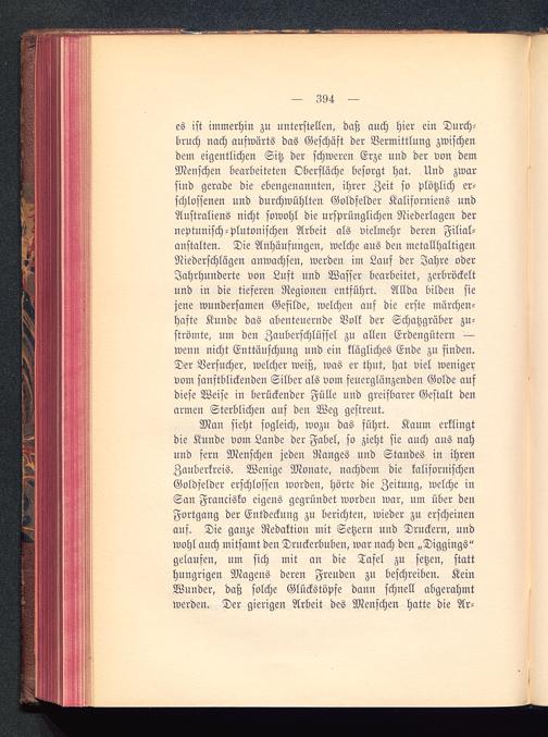 es ist immerhin zu unterstellen, daß auch hier ein Durch-bruch nach aufwärts das Geschäft der Vermittlung zwischendem eigentlichen Sitz der schweren Erze und der von demMenschen bearbeiteten Oberfläche besorgt hat. Und zwarsind gerade die ebengenannten, ihrer Zeit so plötzlich er-schlossenen und durchwühlten Goldfelder Kaliforniens undAustraliens nicht sowohl die ursprünglichen Niederlagen derneptunisch-Plutonischen Arbeit als vielmehr deren Filial-anstalten. Die Anhäufungen, welche aus den metallhaltigenNiederschlägen anwachsen, werden im Lanf der Jahre oderJahrhunderte von Luft nnd Wasser bearbeitet, zerbröckeltund in die tieferen Regionen entführt. Allda bilden siejene wundersamen Gefilde, welchen auf die erste märchen-haste Kunde das abenteuernde Volk der Schatzgräber zu-strömte, um den Zauberschlüssel zu allen Erdengütern ^—wenn nicht Enttäuschung und ein klägliches Ende zu finden.Der Versucher, welcher weiß, was er thut, hat viel wenigervom sanftblickenden Silber als vom feuerglänzenden Golde aufdiese Weise in berückender Fülle und greifbarer Gestalt denarmen Sterblichen auf den Weg gestreut.