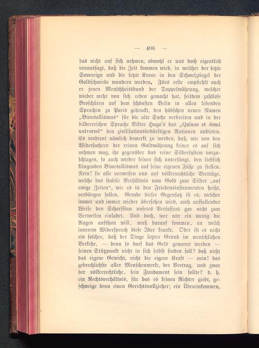 das nicht auf sich nehmen, obwohl er uns doch eigentlichvoraussagt, daß die Zeit kommen wird, in welcher der letzteSovereign und die letzte Krone iu den Schmclztiegel derGoldschmiede wandern werden. Fürs erste empfiehlt aucher jeneu Meuschheitsbund der Doppelwährung, welcherwieder mehr von sich reden gemacht hat, seitdem zahlloseBroschüren auf dem schönsten Velin in allen lebendenSprachen zu Paris gedrnckt, den hübschen neuen Namen„Bimetallismus" für die alte Sache verbreiten und in derbilderreichen Sprache Viktor Hugo's das „(juin?s et clsmiuniverssl" den zivilisationsbedürftigen Nationen anbieten.Es verdient nämlich bemerkt zu werden, daß, wie von denWidersachern der reiuen Goldwährung keiner es auf sichnehmen mag, ihr gegenüber das reine Silbersystem vorzu-schlagen, so auch wieder keiner sich unterfängt, den lieblichklingenden Bimetallismus auf seine eigenen Füße zu stellen.Nein! sie alle verweisen uns auf völkerrechtliche Verträge,welche das stabile Verhältnis vom Gold zum Silber „aufewige Zeiten", wie es in den Friedensinstrilincnten heißt,verbürgen sollen. Gerade dieser Gegensatz ist es, welcherimmer uud immer wieder übersehen wird, auch auffallenderWeise den Scharfsinn unseres Verfassers gar nicht zumVerweilen einladet. Uud doch, wer mir ein wenig dieAugen aufthuu will, muß darauf kommen, au welchinnerem Widerspruch diese Idee krankt. Oder ist es nichtein solcher, daß der Dinge letzter Grund im menschlichenVerkehr, — denn so darf das Geld genannt werden —seinen Stützpunkt nicht in sich selbst finden soll? daß nichtdas eigene Gewicht, nicht die eigene Kraft — nein! dasgebrechlichste aller Mcnschenwerke, der Vertrag, uud zwarder völkerrechtliche, sein Fundament sein sollte? d. h.ein Rechtsverhältnis, für das es keiueu Richter giebt, ge-schweige denu einen Gerichtsvollzieher; ein Übereinkommen,