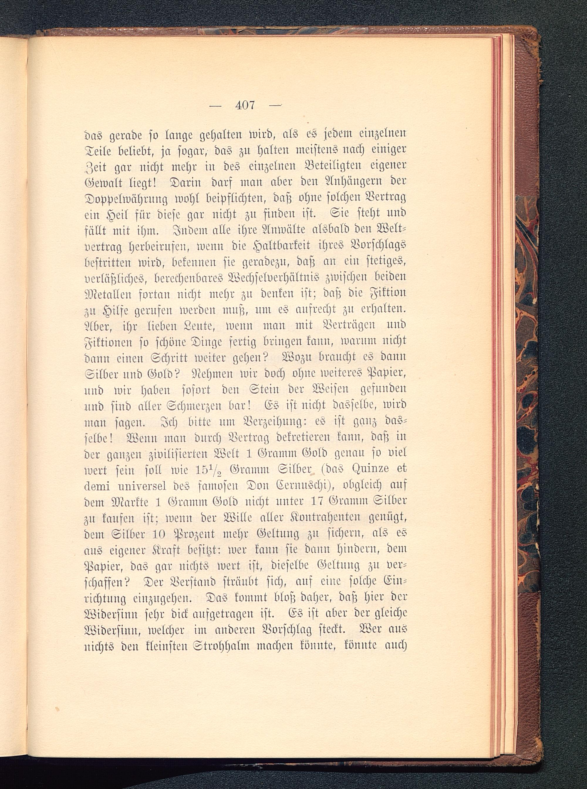 das gerade so lange gehalten wird, als es jedem einzelnenTeile beliebt, ja sogar, das zu halten meistens nach einiger^>eit gar nicht mehr in des einzelnen Beteiligten eigenerGewalt liegt! Darin darf man aber den Anhängern derDoppelwährung wohl beipflichten, daß ohne solchen Vertragein Heil für diese gar nicht zu finden ist. Sie steht undfällt mit ihm. Indem alle ihre Anwälte alsbald den Welt-vertrag herbeirufen, weuu die Haltbarkeit ihres Vorschlagsbestritten wird, bekennen sie geradezu, daß an ein stetiges,verläßliches, berechenbares Wechselverhältnis zwischen beidenMetallen fortan nicht mehr zu denken ist; daß die Fiktionzn Hilfe gerufen werden muß, um es aufrecht zu erhalten.Aber, ihr lieben Lente, wenn man mit Verträgen uudFiktioueu so schone Dinge fertig bringen kann, warnm nichtdann einen Schritt weiter gehen? Wozn braucht es dannSilber uud Gold? Nehmen wir doch ohne weiteres Papier,und wir haben sofort den Stein der Weisen gefundenund sind aller Schmerzen bar! Es ist nicht dasselbe, wirdman sagen. Ich bitte um Verzeihung: es ist ganz das-selbe! Wenn man durch Vertrag dekretieren kann, daß inder ganzen zivilisierten Welt 1 Gramm Gold genau so vielwert sein soll wie 15^ Gramm Silber <das Hnin?s et,äsini universal des famosen Don Cernnschi), obgleich aufdem Markte t Gramm Gold nicht unter l? Gramm Silberzu kaufen ist; wenn der Wille aller Kontrahenten genügt,dem Silber 10 Prozent mehr Geltung zn sichern, als esaus eigener Kraft bescht: wer kaun sie dauu hindern, demPapier, das gar niclM wert ist, dieselbe Geltung zu ver-schaffen? Der Verstand sträubt sich, ans eine solche Ein-richtung einzugehen. DaS kommt bloß daher, daß hier derWidersinn sehr dick aufgetragen ist. Es ist aber der gleicheWidersinn, welcher im anderen Vorschlag steckt. Wer ausnichts den kleinsten Strohhalm machen könnte, könnte auch
