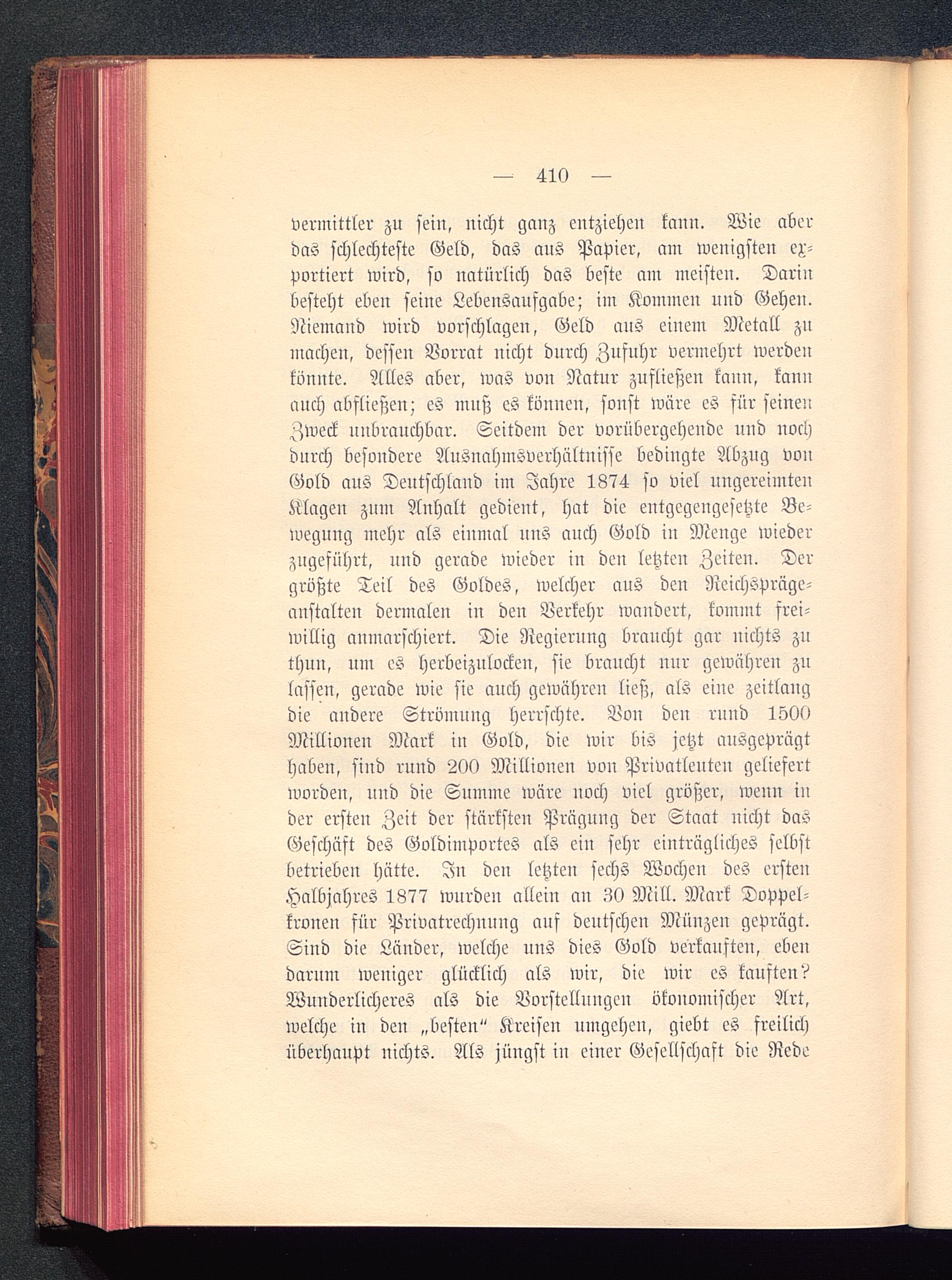 Vermittler zu sein, nicht ganz entziehen kann. Wie aberdas schlechteste Geld, das aus Papier, am wenigsten ex-portiert wird, so natürlich das beste am meisten. Darinbesteht eben seine Lebensaufgabe; im Kommen und Gehen.Niemand wird vorschlagen, Geld aus einem Metall znmachen, dessen Vorrat nicht durch Zufuhr vermehrt werdenkönnte. Alles aber, was von Natur zufließen kann, kannauch abfließen; es muß es können, sonst wäre es für seinenZweck unbrauchbar. Seitdem der vorübergehende uud nochdurch besondere Ausnahmsverhältnisse bedingte Abzng vonGold aus Deutschland im Jahre 1874 so viel ungereimtenKlagen zum Anhalt gedient, hat die entgegengesetzte Be-wegung mehr als einmal uns auch Gold iu Meuge wiederzugeführt, nud gerade wieder in den letzten Zeiten. Dergrößte Teil des Goldes, welcher aus den Reichsprägc-anstaltcn dermalen in den Verkehr wandert, kommt frei-willig anmarschiert. Die Regierung braucht gar nichts znthun, um es herbeizulocken, sie braucht mir gewähren zulassen, gerade wie sie auch gewähren ließ, als eiue zeitlaugdie audere Strömung herrschte. Vou deu rnnd 1500Millionen Mark in Gold, die wir bis jetzt ausgeprägthaben, sind ruud 200 Millionen von Privatleuten geliefertworden, uud die Summe wäre uoch viel größer, weuu inder ersten Zeit der stärksten Prägung der Staat nicht dasGeschäft des Goldimportcs als ein sehr einträgliches selbstbetrieben hätte. In den letzten sechs Wochen deS erstenHalbjahres 1877 wurden allein an 30 Mill. Mark Doppel-kronen für Privatrechnnng auf deutschen Mttuzeu geprägt.Sind die Länder, welche nns dies Gold verkauften, ebendarum weuiger glücklich als wir, die wir es tauften?Wunderlicheres als die Vorstellungen ökonomischer Art,welche in den „besten" Kreisen umgehen, giebt es freilichüberhaupt uichts. Als jüngst in einer Gesellschaft die Rede