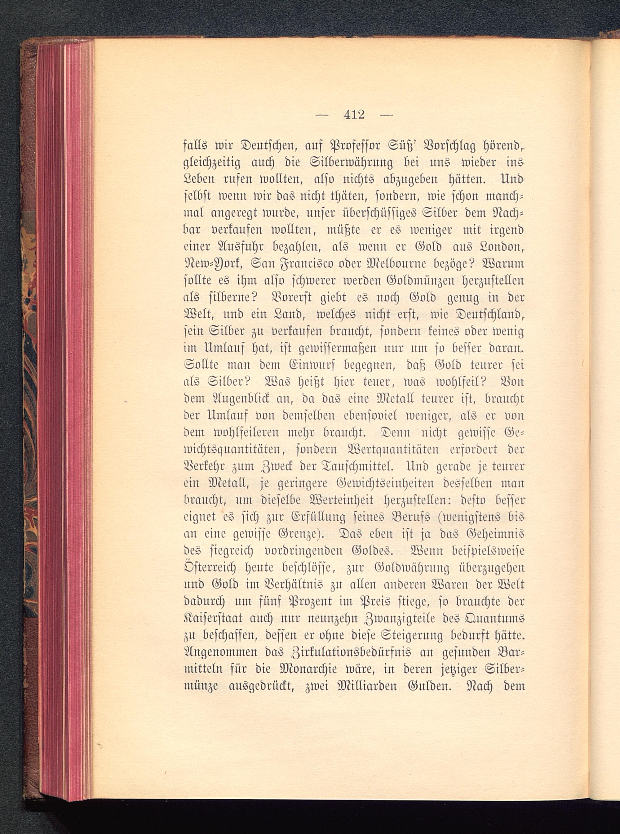 falls wir Deutschen , auf Professor Süß' Vorschlag hörend,,gleichzeitig auch die Silberwährung bei uus wieder insLeben rufen wollten, also nichts abzugeben hätten. Undselbst wenu wir das nicht thäten, fondern, wie schon manch-mal angeregt wurde, unser überschüssiges Silber dem Nach-bar verkaufen wollten, müßte er es weniger mit irgendeiner Ausfuhr bezahlen, als wenn er Gold ans London ,New-Iork, San Francisco oder Melbourne bezöge? Warumsollte es ihm also schwerer werden Goldmünzen herzustellenals silberne? Vorerst giebt es noch Gold genug in derWelt, und ein Land, welches nicht erst, wie Deutschland ,sein Silber zu verkaufen braucht, sondern keines oder wenigim Umlauf hat, ist gewissermaßen nur um so besser daran.Sollte man dem Einwurf begeguen, daß Gold teurer seials Silber? Was heißt hier teuer, was wohlfeil? Vondem Augenblick an, da das eine Metall teurer ist, brauchtder Umlauf von demselben ebensoviel weniger, als er vondem wohlseileren mehr braucht. Denn nicht gewisse Ge-wichtsquantitäten, sondern Wertquantitäten erfordert derVerkehr zum Zweck der Tauschmittel. Und gerade je teurerein Metall, je geringere Gewichtseinheiten desselben manbraucht, nur dieselbe Werteinheit herzustellen: desto bessereignet es sich zur Erfüllung seines Berufs (wenigstens bisan eine gewisse Grenze). Das eben ist ja das Geheimnisdes siegreich vordringenden Goldes. Wenn beispielsweiseOsterreich heute beschlösse, zur Goldwährung überzugehenund Gold im Verhältnis zu alleu anderen Waren der Weltdadurch um fünf Prozent im Preis stiege, so brauchte derKaiserstaat auch nur neunzehn Zwanzigteile des Quantumszu beschaffen, dessen er ohne diese Steigerung bedurft hätte.Angenommen das Zirkulationsbedürfnis an gesunden Bar-mitteln für die Monarchie wäre, in deren jetziger Silber-münze ausgedrückt, zwei Milliarden Gulden. Nach dem