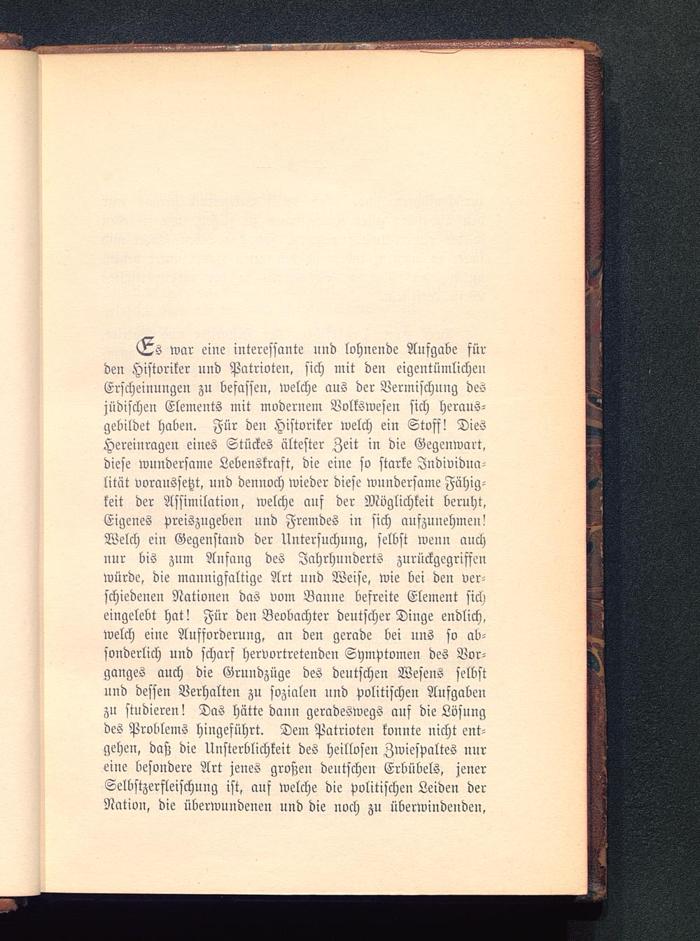 (^s war eine interessante nnd lohnende Aufgabe fürden Historiker und Patrioten, sich mit den eigentümlichenErscheinungen zu befassen, welche aus der Vermischung desjüdischen Elements mit modernem Volkswesen sich heraus-gebildet haben. Für den Historiker welch ein Stoff! DiesHereinragen eines Stückes ältester Zeit in die Gegenwart,diese wnndersame Lebenskraft, die eine so starke Individua-lität voraussetzt, und dennoch wieder diese wundersame Fähig-keit der Assimilation, welche auf der Möglichkeit beruht,Eigenes preiszugeben und Fremdes in sich aufzunehmen!Welch ein Gegenstand der Untersuchung, selbst wenn auchnur bis zum Anfang des Jahrhunderts zurückgegriffenwürde, die mauuigfaltige Art und Weise, wie bei den ver-schiedenen Nationen das vom Banne befreite Element sicheingelebt hat! Für den Beobachter deutscher Dinge endlich,welch eine Aufforderung, an den gerade bei nns so ab-sonderlich und scharf hervortretenden Symptomen des Vor-ganges auch die Grundzüge des deutschen Wesens selbstund dessen Verhalten zu sozialen und politischen Aufgabenzu studieren! Das hätte dann geradeswegs auf die Lösungdes Problems hingeführt. Dem Patrioten konnte nicht ent-gehen, daß die Unsterblichkeit des heillosen Zwiespaltes nureine besondere Art jenes großen deutschen Erbübels, jenerSelbstzerfleischung ist, auf welche die politischen Leiden derNation, die überwundenen und die noch zu überwindenden,