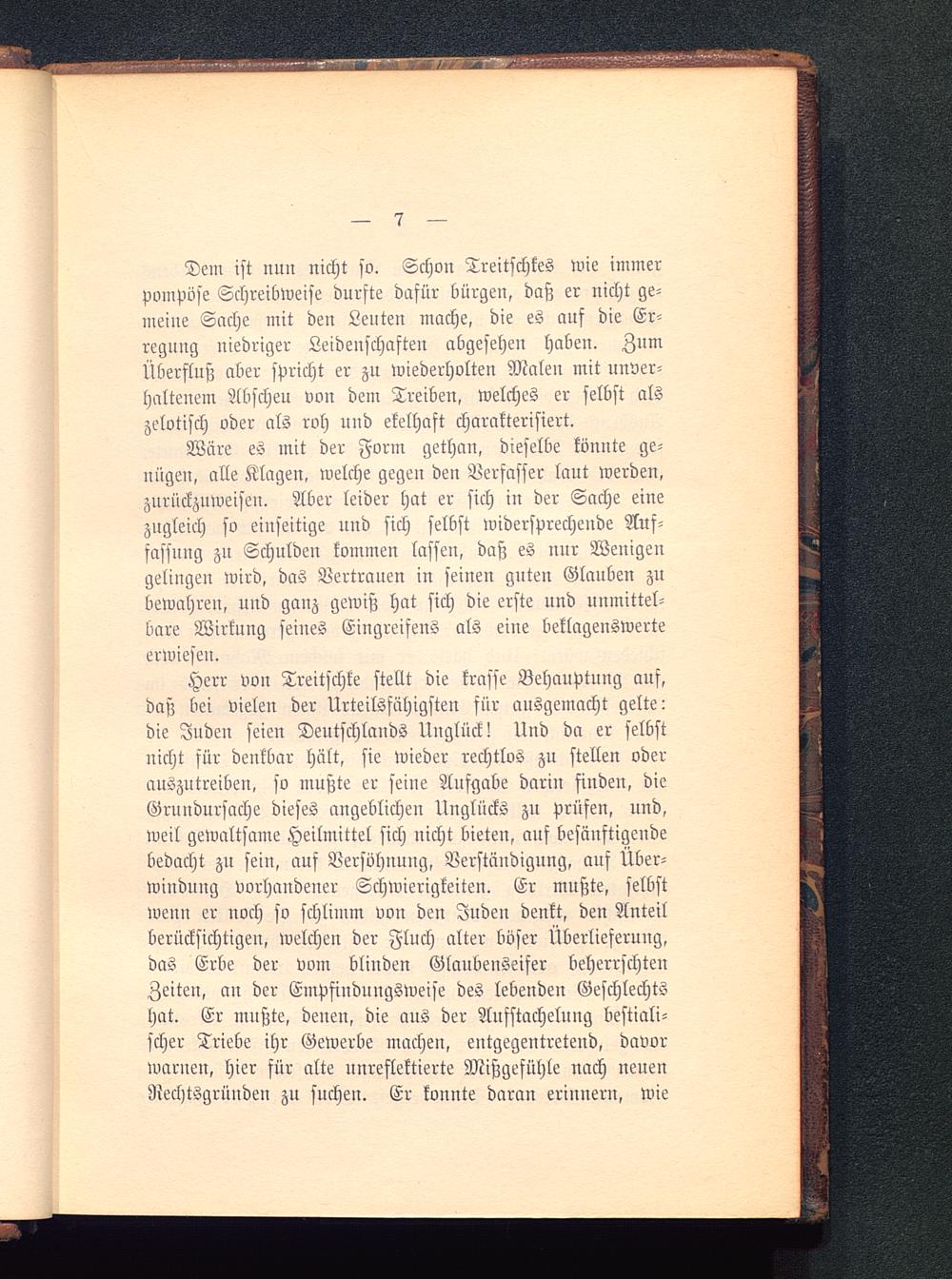 Herr von Treitschke stellt die krasse Behauptung auf,daß bei vieleu der Urteilsfähigsten für ausgemacht gelte:die Juden seien Deutschlands Unglück! Und da er selbstnicht für denkbar hält, sie wieder rechtlos zu stellen oderauszntreiben, so mußte er seine Aufgabe darin finden, dieGrundursache dieses angeblichen Unglücks zu prüfen, und,weil gewaltsame Heilmittel sich nicht bieten, auf besänftigendebedacht zu sein, auf Versöhnung, Verständigung, auf Über-windung vorhandener Schwierigkeiten. Er mußte, selbstwenn er noch so schlimm von den Juden denkt, den Anteilberücksichtigen, welchen der Fluch alter böser Überlieferung,das Erbe der vom blinden Glaubenseifer beherrschtenZeiten, an der Empfindungsweise des lebenden Geschlechtshat. Er mußte, denen, die aus der Aufstacheluug bestiali-scher Triebe ihr Gewerbe machen, entgegentretend, davorwarnen, hier für alte unreslektierte Mißgefühle nach neuenNechtsgründen zu suchen. Er konnte daran erinnern, wie