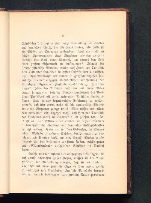 Jahrbücher") bringt er eine ganze Sammlung von Stellenans demselben Werke, die allerdings lauten, als hätte sieein Stöcker der Synagoge geschrieben. Was aber soll mitsolchen Extravaganzen eines Einzelnen bemiesen werden?Genügt das Buch eines Mannes, um daraus den Geisteiner großen Gesamtheit zn konstruieren? Erlaubt diestrenge historische Methode, welche nach Herrn von Treitschkedem Botaniker Schleiden in dessen Schrift über die wissen-schaftlichen Verdienste der Juden so gänzlich abgehen soll,mit Hilfe einer einzigen absonderlichen Erscheinung denGrundzug allgemeiner Zustände apodiktisch zu charakteri-sieren? Hütte der Anklüger auch nur mit einem Belegdarauf hingewiesen, daß die jüdischen Landsleute des Bres-lauer Professors mit dessen grimmigen Ausfällen sympathi-sieren; hätte er aus irgendwelcher Erfahrung zu meldengewußt, daß hier etwas mehr als die wunderliche Sinnes-art eines Einzelnen zutage tritt! Aber nichts von alleindem vernehmen wir, dagegen wohl, daß Herr von Treitschkedas Buch von Grätz im Sommer 1879 gelesen hat. Ja,so ist es. Die Lektüre eines Buches im letzten Sommerist das historische Material, mit dem solche Anklageschriftenverfaßt werden. Entfernen wir den Gedanken, die Spurensolcher Methode in anderen Sphären der Litteratur zu ver-folgen; wir könnten sonst, um eine Anzahl Stufen herab-steigend, auf das Geheimnis der Leute stoßen, welche gegendas „Milliardenland" vielgelesene Schriften in Umlaufsetzen.
