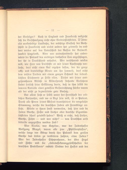 Vor allem steht er selbst unter der Herrschaft der erb-lichen Antipathie, und wo er Arzt sein will, ist er Patient.Dnrch alle Poreu seiues Wesens transspiriert die vorgefaßteStimmung, welche die deutscheu Juden als Fremdlinge an-sieht. Würde er il>nen sonst vorwerfen, daß hier und daJuden Goethe, Fichte und Luther oder deutsche Eigentüm-lichkeiten scharf getadelt haben? Weiß er nicht, daß Luther,Goethe, Fichte — und wer nicht? — von Deutschen aufsbitterste augegriffen worden sind?