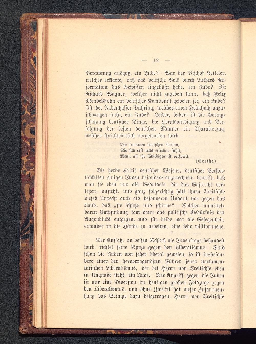Der Aufsatz, an dessen Schluß die Judenfrage behandeltwird, richtet seine Spitze gegen den Liberalismus. Sindschon die Juden von jeher liberal gewesen, so ist insbeson-dere einer der hervorragendsten Führer jenes parlamen-tarischen Liberalismus, der bei Herrn von Treitschke ebenin Ungnade steht, ein Jude. Der Angriff gegen die Judenist nur eine Diversion im heutigen großen Feldzuge gegenden Liberalismus, und ohne Zweifel hat dieser Zusammen-hang das Seiinge dazu beigetragen, Herrn von Treitschke