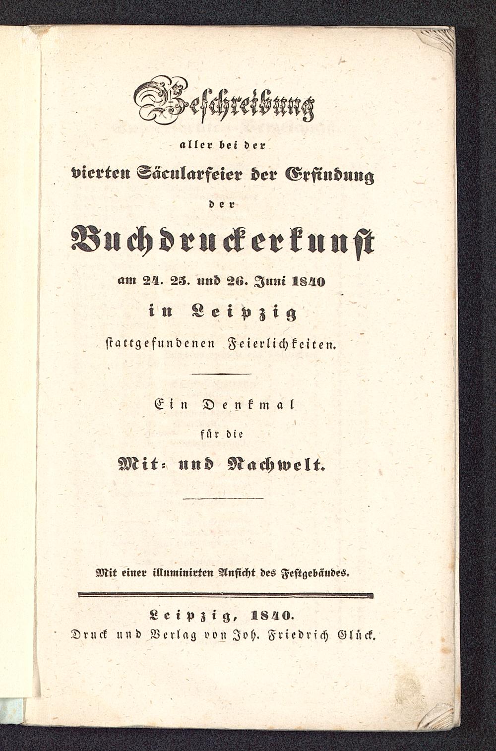 Beschreibung aller bei der vierten Säcularfeier der Erfindung der Buchdruckerkunst am 24. 25. und 26 Juni 1840 in Leipzig stattgefundenen Feierlichkeiten : ein Denkmal für die Mit- und Nachwelt