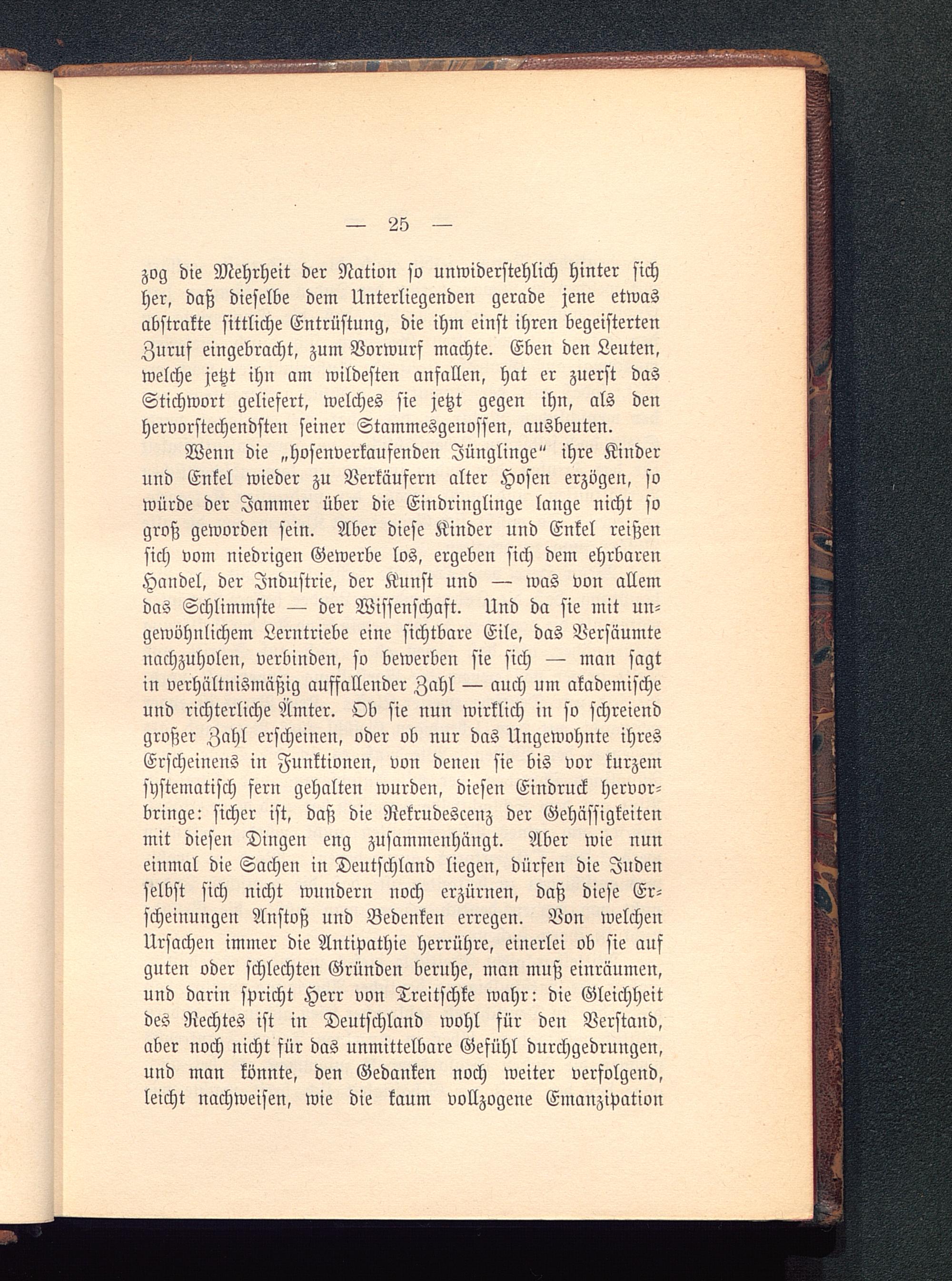 Wenn die „hosenverkaufenden Jünglinge" ihre Kinderund Enkel wieder zu Verkäufern alter Hosen erzögen, sowürde der Jammer über die Eindringlinge lange nicht sogroß geworden sein. Aber diese Kinder und Enkel reißensich vom niedrigen Gewerbe los, ergeben sich dem ehrbarenHandel, der Industrie, der Kunst und — was von allemdas Schlimmste — der Wissenschaft. Und da sie mit un-gewöhnlichem Lerntriebe eine sichtbare Eile, das Versäumtenachzuholen, verbinden, so bewerben sie sich — man sagtin verhältnismäßig auffallender Zahl — auch um akademischeund richterliche Ämter. Ob sie nun wirklich in so schreiendgroßer Zahl erscheinen, oder ob nur das Ungewohnte ihresErscheinens in Funktionen, von denen sie bis vor kurzemsystematisch fern gehalten wurden, diesen Eindruck hervor-bringe: sicher ist, daß die Rekrudescenz der Gehässigkeitenmit diesen Dingen eng zusammenhängt. Aber wie nuneinmal die Sachen in Deutschland liegen, dürfen die Judenselbst sich nicht Wundern noch erzürnen, daß diese Er-scheinungen Anstoß und Bedenken erregen. Von welchenUrsachen immer die Antipathie herrühre, einerlei ob sie aufguten oder schlechten Gründen beruhe, man muß einräumen,und darin spricht Herr von Treitschke wahr: die Gleichheitdes Rechtes ist in Deutschland wohl für den Verstand,aber noch nicht für das unmittelbare Gefühl durchgedrungen,und man könnte, den Gedanken noch weiter verfolgend,leicht nachweisen, wie die kaum vollzogene Emanzipation