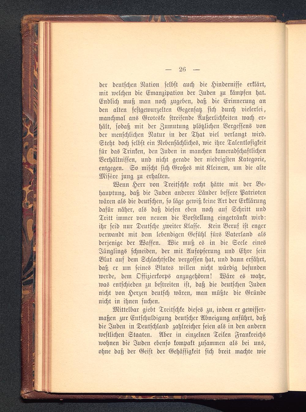 Wenn Herr von Treitschke recht hätte mit der Be-hauptung, daß die Juden anderer Länder bessere Patriotenwären als die deutschen, so läge gewiß keine Art der Erklärungdafür näher, als daß diesen eben noch auf Schritt undTritt immer von neuem die Vorstellung eingetränkt wird:ihr seid nur Deutsche zweiter Klasse. Kein Beruf ist engerverwandt mit dem lebendigen Gefühl fürs Vaterland alsderjenige der Waffen. Wie muß es in die Seele einesJünglings schneiden, der mit Aufopferung und Ehre seinBlut auf dem Schlachtfelde vergossen hat, und dann erfährt,daß er um seines Blutes willen nicht würdig befnndenwerde, dem Offizierkorps anzugehören! Wäre es wahr,was entschieden zu bestreiken ist, daß die deutschen Judennicht von Herzen deutsch wären, man müßte die Gründenicht in ihnen suchen.