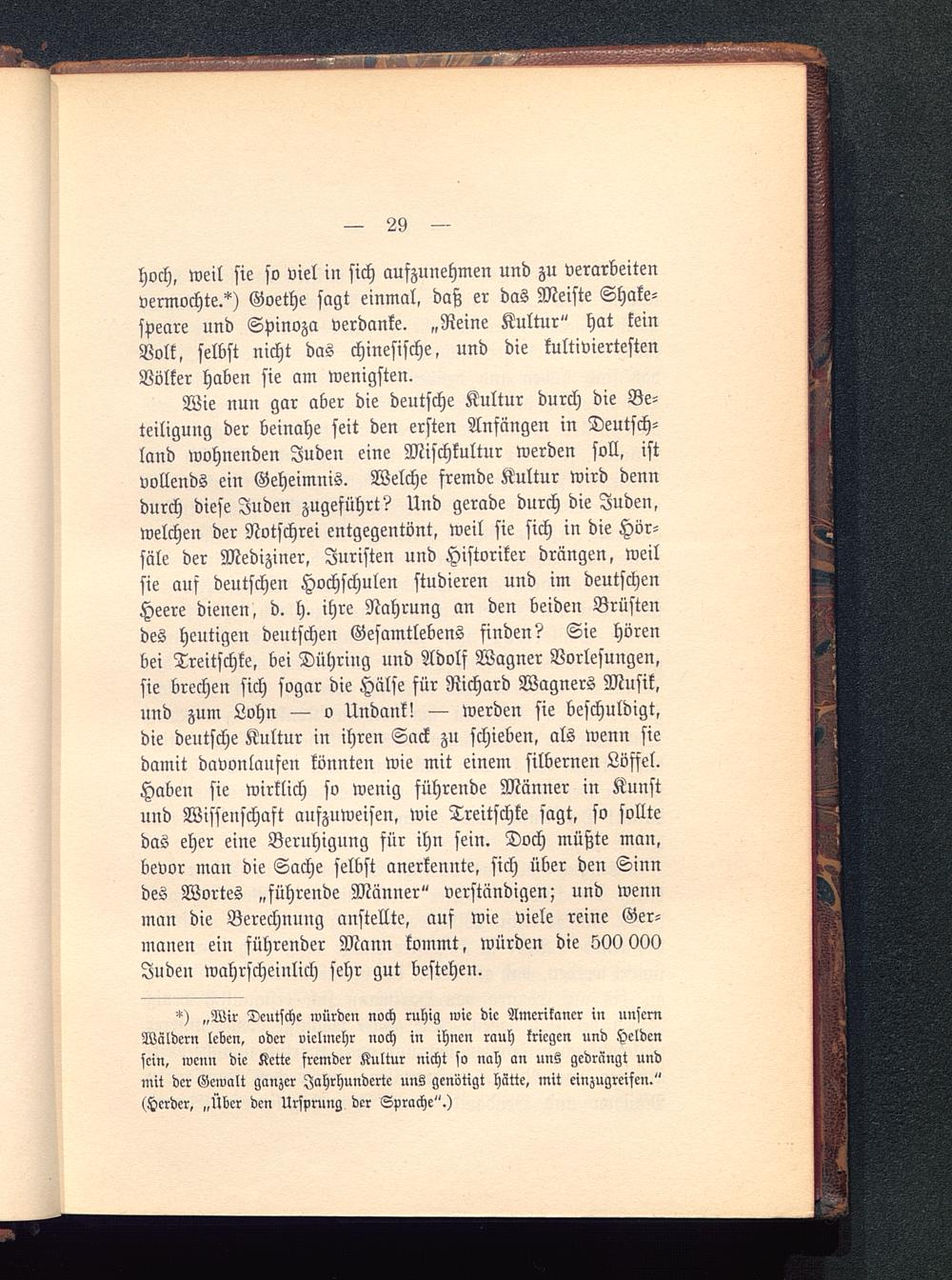 Wie nun gar aber die deutsche Kultur durch die Be-teiligung der beinahe seit den ersten Anfängen in Deutsch-land wohnenden Juden eine Mischkultur werden soll, istvollends ein Geheimnis. Welche fremde Kultur wird denndurch diese Juden zugeführt? Und gerade durch die Juden,welchen der Notschrei entgegentöut, weil sie sich in die Hör-säle der Mediziner, Juristen und Historiker drängen, weilsie auf deutschen Hochschulen studieren und im deutschenHeere dienen, d. h. ihre Nahrung an den beiden Brüstendes heutigen deutschen Gesamtlebens finden? Sie hörenbei Treitschke , bei Dühring und Adolf Wagner Vorlesungen,sie brechen sich sogar die Hälse für Richard Wagners Musik,und zum Lohn — o Undank! — werden sie beschuldigt,die deutsche Kultur in ihren Sack zu schieben, als wenn siedamit davonlaufen könnten wie mit einem silbernen Löffel.Haben sie wirklich so wenig führende Männer in Kunstuud Wissenschaft aufzuweisen, wie Treitschke sagt, so solltedas eher eine Beruhigung für ihn sein. Doch müßte man,bevor man die Sache selbst anerkennte, sich über den Sinndes Wortes „führende Männer" verständigen; und wennman die Berechnung anstellte, auf wie viele reine Ger-manen ein führender Mann kommt, würden die 500 000Juden wahrscheinlich sehr gut bestehen.