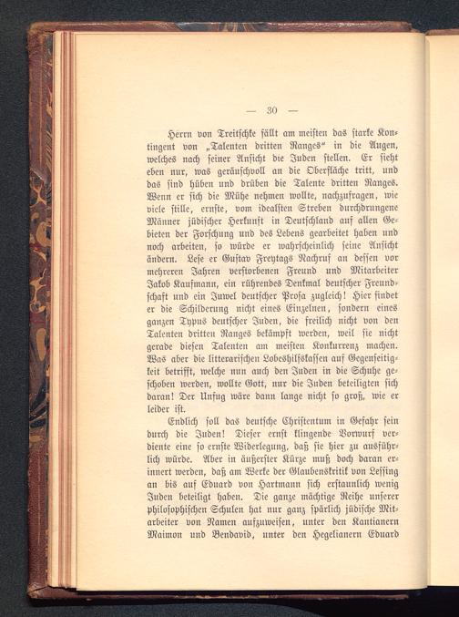 Herrn von Treitschke fällt am meisten das starke Kon-tingent von „Talenten dritten Ranges" in die Augen,welches nach seiner Ansicht die Juden stellen. Er siehteben nur, was geräuschvoll an die Oberfläche tritt, unddas sind hüben und drüben die Talente dritten Ranges.Wenn er sich die Mühe nehmen wollte, nachzufragen, wieviele stille, ernste, vom idealsten Streben durchdrungeneMänner jüdischer Herkunft in Deutschland auf allen Ge-bieten der Forschung und des Lebens gearbeitet haben undnoch arbeiten, so würde er wahrscheinlich seine Ansichtändern. Lese er Gustav Freytags Nachruf an dessen vormehreren Jahren verstorbenen Freund und MitarbeiterJakob Kaufmann, ein rührendes Denkmal deutscher Freund-schaft und ein Juwel deutscher Prosa zugleich! Hier findeter die Schilderung nicht eines Einzelnen, sondern einesganzen Typus deutscher Juden, die freilich nicht von denTalenten dritten Ranges bekämpft werden, weil sie nichtgerade diesen Talenten am meisten Konkurrenz machen.Was aber die litterarischen Lobeshilfskassen auf Gegenseitig-keit betrifft, welche nun auch den Juden in die Schuhe ge-schoben werden, wollte Gott , nur die Juden beteiligten sichdaran! Der Unfug wäre dann lange nicht so groß, wie erleider ist.