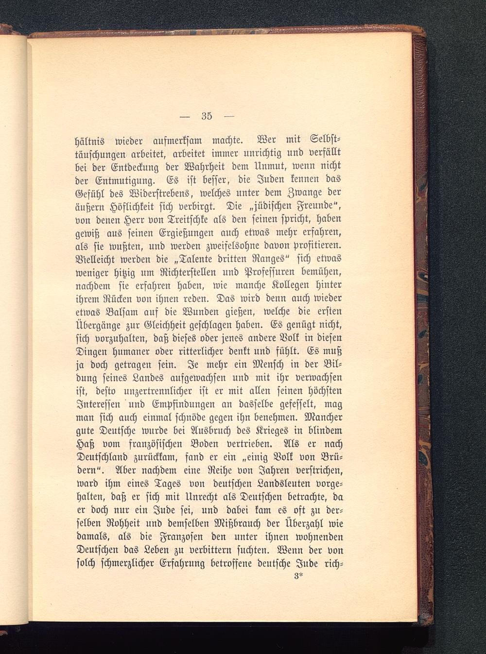 hältnis wieder aufmerksam machte. Wer mit Selbst-täuschungen arbeitet, arbeitet immer unrichtig und verfälltbei der Entdeckung der Wahrheit dem Unmut, wenn nichtder Entmutigung. Es ist besser, die Juden kennen dasGefühl des Widerstrebens, welches unter dem Zwange deräußern Höflichkeit sich verbirgt. Die „jüdischen Freunde",von denen Herr von Treitschke als den seinen spricht, habengewiß aus seinen Ergießungen auch etwas mehr erfahren,als sie wußten, und werden zweifelsohne davon profitieren.Vielleicht werden die „Talente dritten Ranges" sich etwasweniger hitzig um Richterstellen und Professuren bemühen,nachdem sie erfahren haben, wie manche Kollegen hinterihrem Rücken von ihnen reden. Das wird denn auch wiederetwas Balsam auf die Wunden gießen, welche die erstenÜbergänge zur Gleichheit geschlagen haben. Es genügt nicht,sich vorzuhalten, daß dieses oder jenes andere Volk in diesenDingen humaner oder ritterlicher denkt und fühlt. Es mußja doch getragen sein. Je mehr ein Mensch in der Bil-dung seines Landes aufgewachsen und mit ihr verwachsenist, desto unzertrennlicher ist er mit allen seinen höchstenInteressen und Empfindungen an dasselbe gefesselt, magman sich auch einmal schnöde gegen ihn benehmen. Manchergute Deutsche wurde bei Ausbruch des Krieges in blindemHaß vom französischen Boden vertrieben. Als er nachDeutschland zurückkam, fand er ein „einig Volk von Brü-dern". Aber nachdem eine Reihe von Jahren verstrichen,ward ihm eines Tages von deutschen Landsleuten vorge-halten, daß er sich mit Unrecht als Deutschen betrachte, daer doch nur ein Jude sei, und dabei kam es oft zu der-selben Rohheit und demselben Mißbrauch der Überzahl wiedamals, als die Franzosen den unter ihnen wohnendenDeutschen das Leben zu verbittern suchten. Wenn der vonsolch schmerzlicher Erfahrung betroffene deutsche Jude rich-