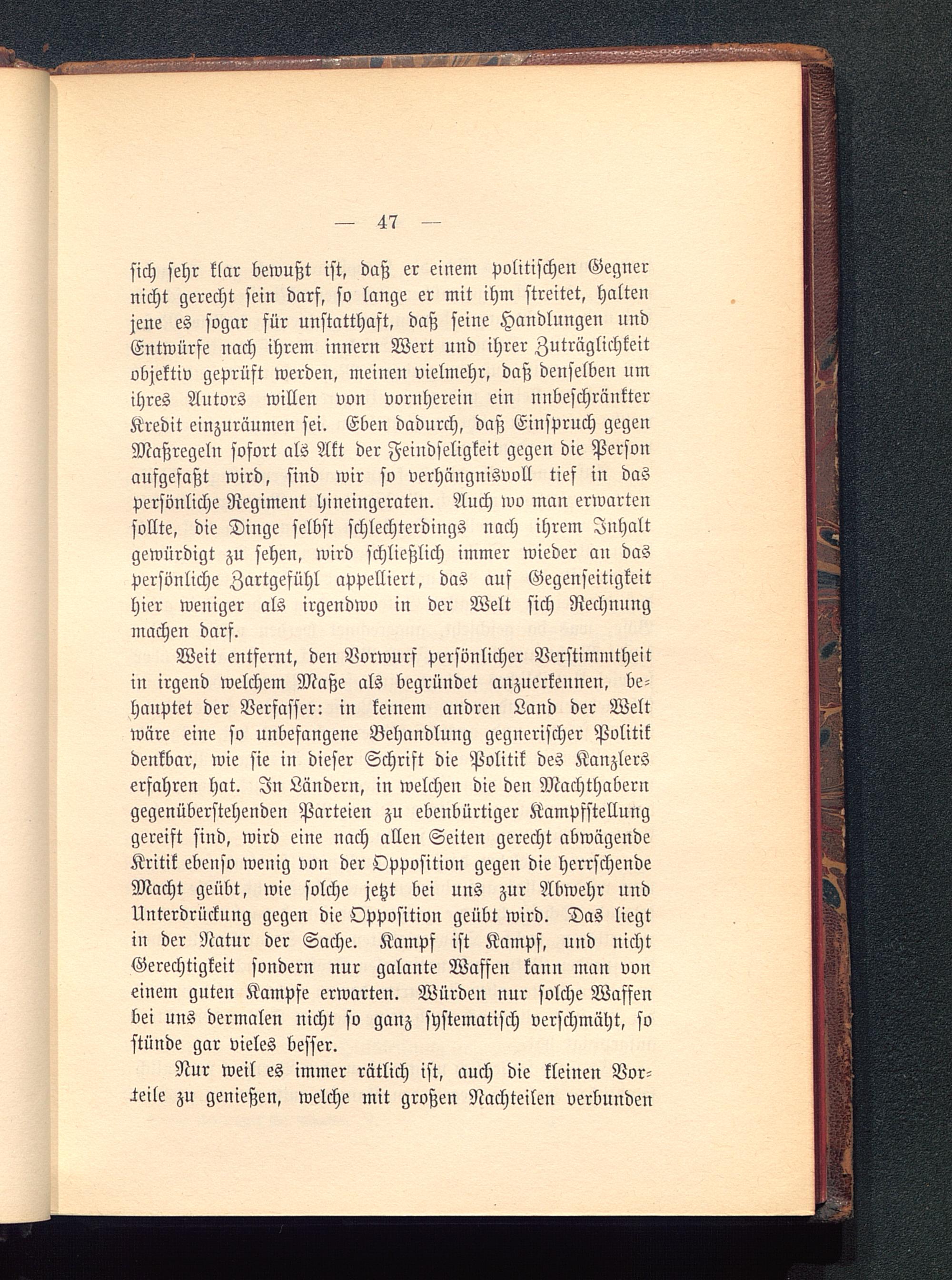 Weit entfernt, den Vorwurf persönlicher Verstimmtheitin irgend welchem Maße als begründet anzuerkennen, be-hauptet der Verfasser: in keinem andren Land der Weltwäre eine so unbefangene Behandlung gegnerischer Politikdenkbar, wie sie in dieser Schrift die Politik des Kanzlerserfahren hat. In Ländern, in welchen die den Machthaberngegenüberstehenden Parteien zu ebenbürtiger Kampfstellunggereift sind, wird eine nach allen Seiten gerecht abwägendeKritik ebenso wenig von der Opposition gegen die herrschendeMacht geübt, wie solche jetzt bei uns zur Abwehr undUnterdrückung gegen die Opposition geübt wird. Das liegtin der Natur der Sache. Kampf ist Kampf, und nichtGerechtigkeit sondern nur galante Waffen kann man voneinem guten Kampfe erwarten. Würden nur solche Waffenbei uns dermalen nicht so ganz systematisch verschmäht, sostünde gar vieles besser.