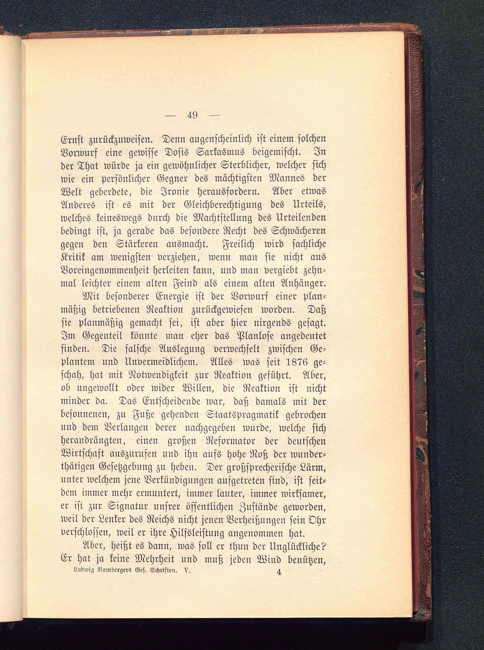 Mit besonderer Energie ist der Vorwurf einer plan-mäßig betriebenen Reaktion zurückgewiesen worden. Daßsie planmäßig gemacht sei, ist aber hier nirgends gesagt.Im Gegenteil könnte man eher das Planlose angedeutetfinden. Die falsche Auslegung verwechselt zwischen Ge-plantem und Unvermeidlichem. Alles was seit 1876 ge-schah, hat mit Notwendigkeit zur Reaktion geführt. Aber,ob ungewollt oder wider Willen, die Reaktion ist nichtminder da. Das Entscheidende war, daß damals mit derbesonnenen, zu Fuße gehenden Staatspragmatik gebrochenund dem Verlangen derer nachgegeben wurde, welche sichherandrängten, einen großen Reformator der deutschenWirtschaft auszurufen und ihn aufs hohe Roß der wuuder-thätigen Gesetzgebung zu heben. Der großsprecherische Lärm,unter welchem jene Verkündigungen aufgetreten sind, ist seit-dem immer mehr ermuntert, immer lauter, immer wirksamer,er ist zur Signatur unsrer öffentlichen Zustände geworden,weil der Lenker des Reichs nicht jenen Verheißungen sein Ohrverschlossen, weil er ihre Hilfsleistung angenommen hat.
