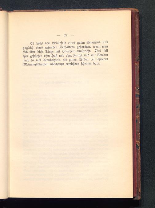 Es heißt dem Bedürfnis eines guten Gewissens undzugleich eines gesunden Verhaltens gehorchen, wenn mansich über diese Dinge mit Offenheit ausspricht. Dies sollhier geschehen ohne Haß und ohne Furcht und mit Strebennach so viel Gerechtigkeit, als gutem Willen bei schwerenMeinungskämpfen überhaupt erreichbar scheinen darf.