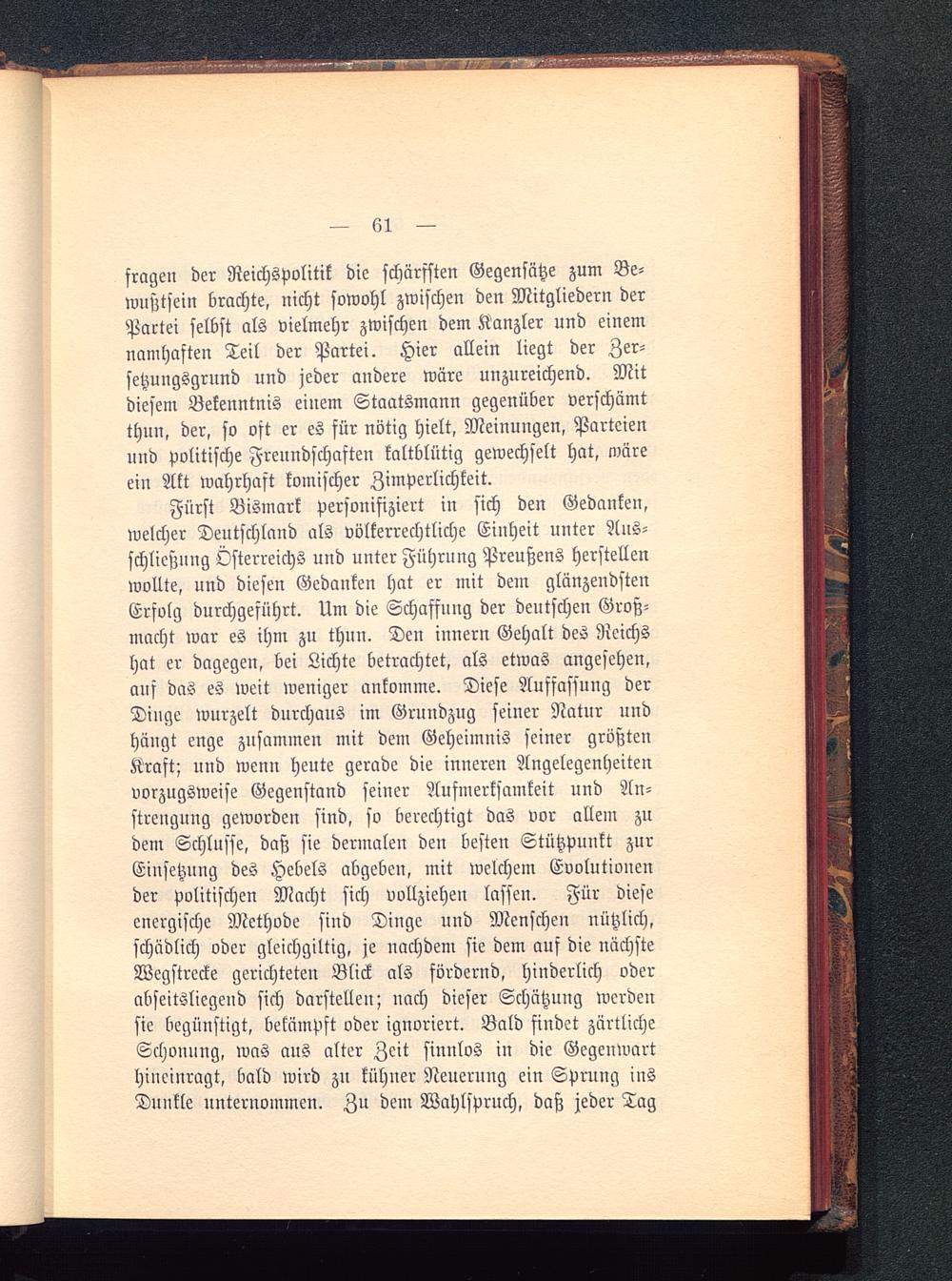 Fürst Vismark personifiziert in sich den Gedanken,welcher Deutschland als völkerrechtliche Einheit unter Aus-schließung Österreichs und unter Führung Preußens herstellenwollte, und diesen Gedanken hat er mit dem glänzendstenErfolg durchgeführt. Um die Schaffung der deutschen Groß-macht war es ihm zu thuu. Den innern Gehalt des Reichshat er dagegen, bei Lichte betrachtet, als etwas angesehen,ans das es weit weniger ankomme. Diese Auffasfuug derDiuge wurzelt durchaus im Grundzug seiuer Natur undhängt enge zusammen mit dem Geheimnis seiner größtenKraft; und wenn heute gerade die inneren Angelegenheitenvorzugsweise Gegenstand seiner Aufmerksamkeit und An-strengung geworden sind, so berechtigt das vor allem zudem Schlüsse, daß sie dermalen den besten Stützpunkt zurEinsetzung des Hebels abgeben, mit welchem Evolutionender politischen Macht sich vollziehen lassen. Für dieseenergische Methode sind Diuge und Menschen nützlich,schädlich oder gleichgiltig, je nachdem sie dem auf die uächsteWegstrecke gerichteten Blick als fördernd, hinderlich oderabseitsliegend sich darstellen; nach dieser Schätzung werdensie begünstigt, bekämpft vder ignoriert. Bald findet zärtlicheSchonung, was aus alter Zeit sinnlos in die Gegenwarthineinragt, bald wird zu kühner Neuerung ein Sprung insDunkle unternommen. Zu dem Wahlspruch, daß jeder Tag