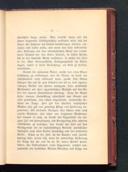 Gerade die eminenten Gaben, welche den einen Mannbefähigten, zu vollbringen, was die Nation im Laufe derJahrhunderte uicht vollbracht hatte, gerade diese Gabenschlugen ihm und ihr zum Schaden aus als er, dem eigenen,richtigen Gefühl von ehedem entsagend, seine PersönlicheWirksamkeit mit ihrer eigentümlichen Methode auf das Ge-biet des inneren Staatslebens übertrug. Denn der Naturdieser iuneren Entwicklung widerstrebt von Grund ausalles gewaltsame, von außen eingreifende, mechanische Er-fassen der Dinge. Hier gilt kein schnelles, urplötzlichesMachen, hier gilt nur geduldige Pflege und Förderung ein-geborener, still wirkender Anlagen; hier lohnen nicht rascherzielte Resultate, hier lohnt nur langsames Wachstum;hier frommt es nicht, im Dienst des Augenblicks ein ein-ziges Ziel mit Hintansetzung und Preisgebung aller anderenrücksichtslos zu verfolgen, hier beruht das Heil auf demGleichgewicht der im tausendfältigen Getriebe menschlicherThätigkeit nach allen Seiten ebenmäßig und frei waltendenKräfte. Schon zu der Zeit, da der Kanzler noch Zurück-haltung übte, verriet sich, wenn die notwendige Verkettungder Dinge ihn hie und da an die innere Politik heran-führte, die Unberufenheit eines Ingeniums, welches vor-zugsweise mit drastischen Mitteln Menschen und Dinge von