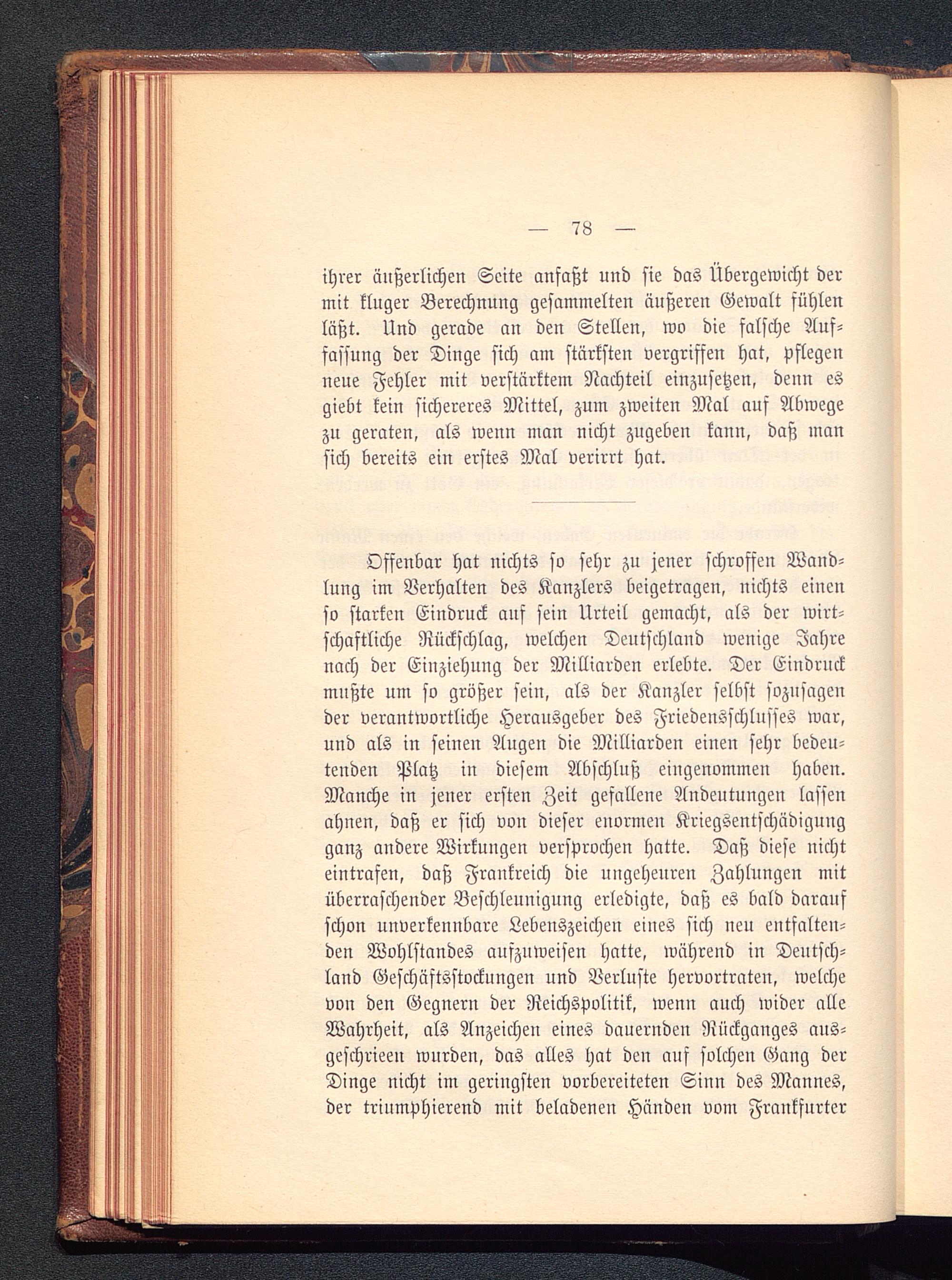 Offenbar hat nichts so sehr zu jener schroffen Wand-lung im Verhalten des Kanzlers beigetragen, nichts einenso starken Eindruck auf sein Urteil gemacht, als der wirt-schaftliche Rückschlag, welchen Deutschland wenige Jahrenach der Einziehung der Milliarden erlebte. Der Eindruckmußte um so größer sein, als der Kanzler selbst sozusagender Verantwortliche Herausgeber des Friedensschlusses war,und als in seinen Augen die Milliarden einen sehr bedeu-tenden Platz in diesem Abschluß eingenommen haben.Manche in jeuer ersten Zeit gefallene Andeutungen lassenahnen, daß er sich von dieser enormen Kriegsentschädigungganz andere Wirkungen versprochen hatte. Daß diese nichteintrafen, daß Frankreich die ungeheuren Zahlungen mitüberraschender Beschleunigung erledigte, daß es bald daraufschon unverkennbare Lebenszeichen eines sich neu entfalten-den Wohlstandes anfznweisen hatte, während in Deutsch-land Geschäftsstockungen und Verluste hervortraten, welchevon den Gegnern der Reichspolitik, wenn auch wider alleWahrheit, als Anzeichen eines dauernden Rückganges aus-geschrieen wnrden, das alles hat den auf solchen Gang derDinge nicht im geringsten vorbereiteten Sinn des Mannes,der triumphierend mit beladenen Händen vom Frankfurter