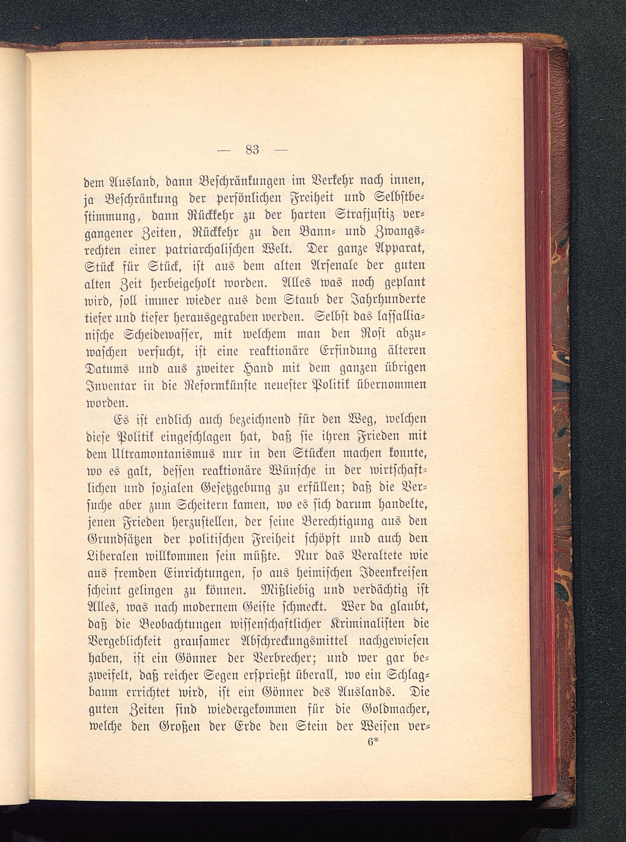 dem Ausland, dann Beschränkungen im Verkehr nach innen,ja Beschränkung der persönlichen Freiheit und Selbstbe-stimmung, dann Rückkehr zu der harten Strafjustiz ver-gangener Zeiten, Rückkehr zu den Bann- und Zwangs-rechten einer patriarchalischen Welt. Der ganze Apparat,Stück für Stück, ist aus dem alten Arsenale der gutenalten Zeit herbeigeholt worden. Alles was noch geplantwird, soll immer wieder ans dem Staub der Jahrhundertetiefer und tiefer herausgegraben werden. Selbst das lassallia-nische Scheidewasser, mit welchem man den Rost abzu-waschen versucht, ist eine reaktionäre Erfindung älterenDatums und aus zweiter Hand mit dem ganzen übrigenInventar in die Neformkünste neuester Politik übernommenworden.