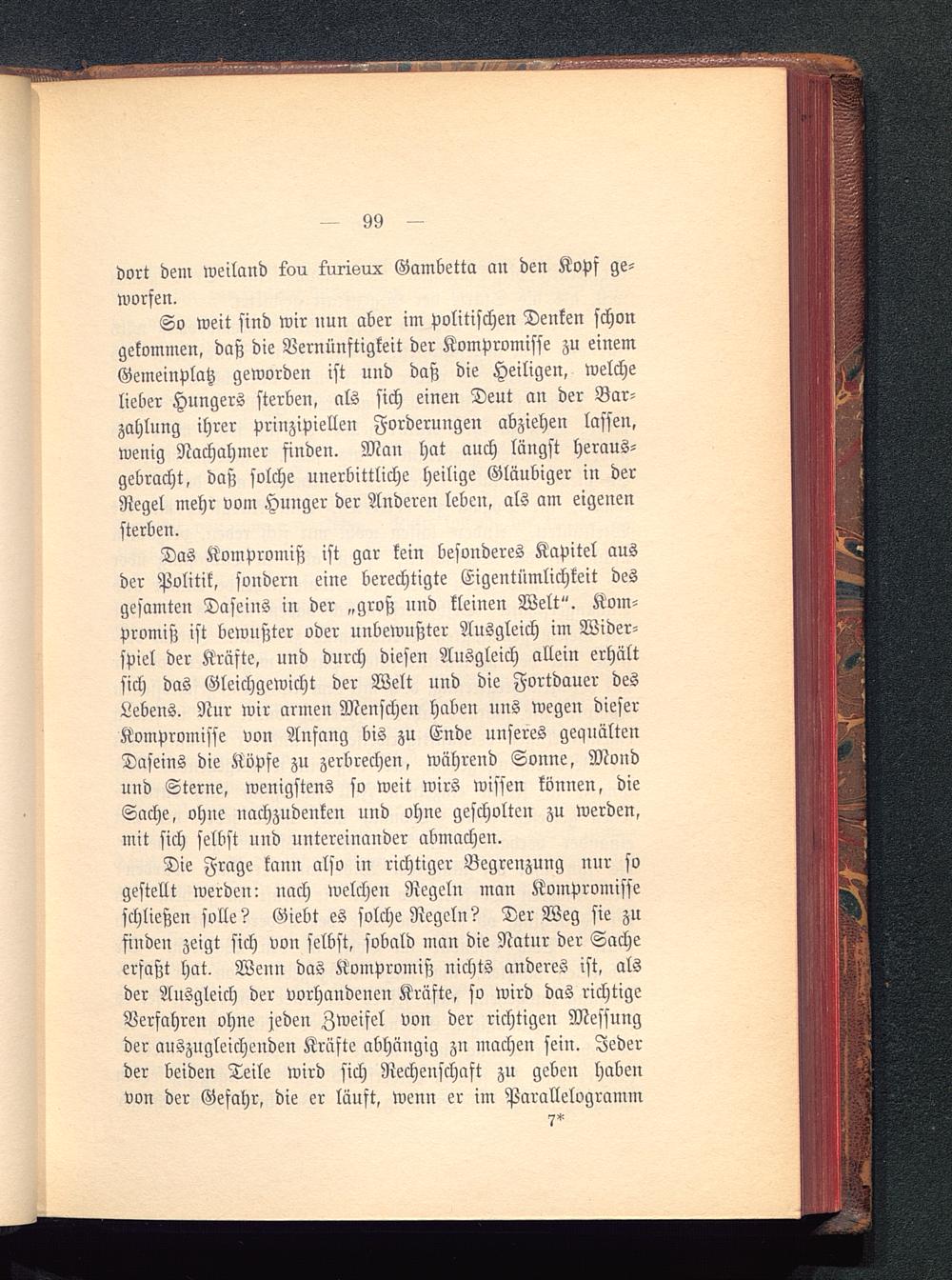 So weit sind wir nun aber im politischen Denken schongekommen, daß die Vernünftigkeit der Kompromisse zu einemGemeinplatz geworden ist und daß die Heiligen, welchelieber Hungers sterben, als sich einen Deut an der Bar-zahlung ihrer prinzipiellen Forderungen abziehen lassen,wenig Nachahmer finden. Man hat auch längst heraus-gebracht, daß solche unerbittliche heilige Gläubiger in derRegel mehr vom Hunger der Anderen leben, als am eigenensterben.