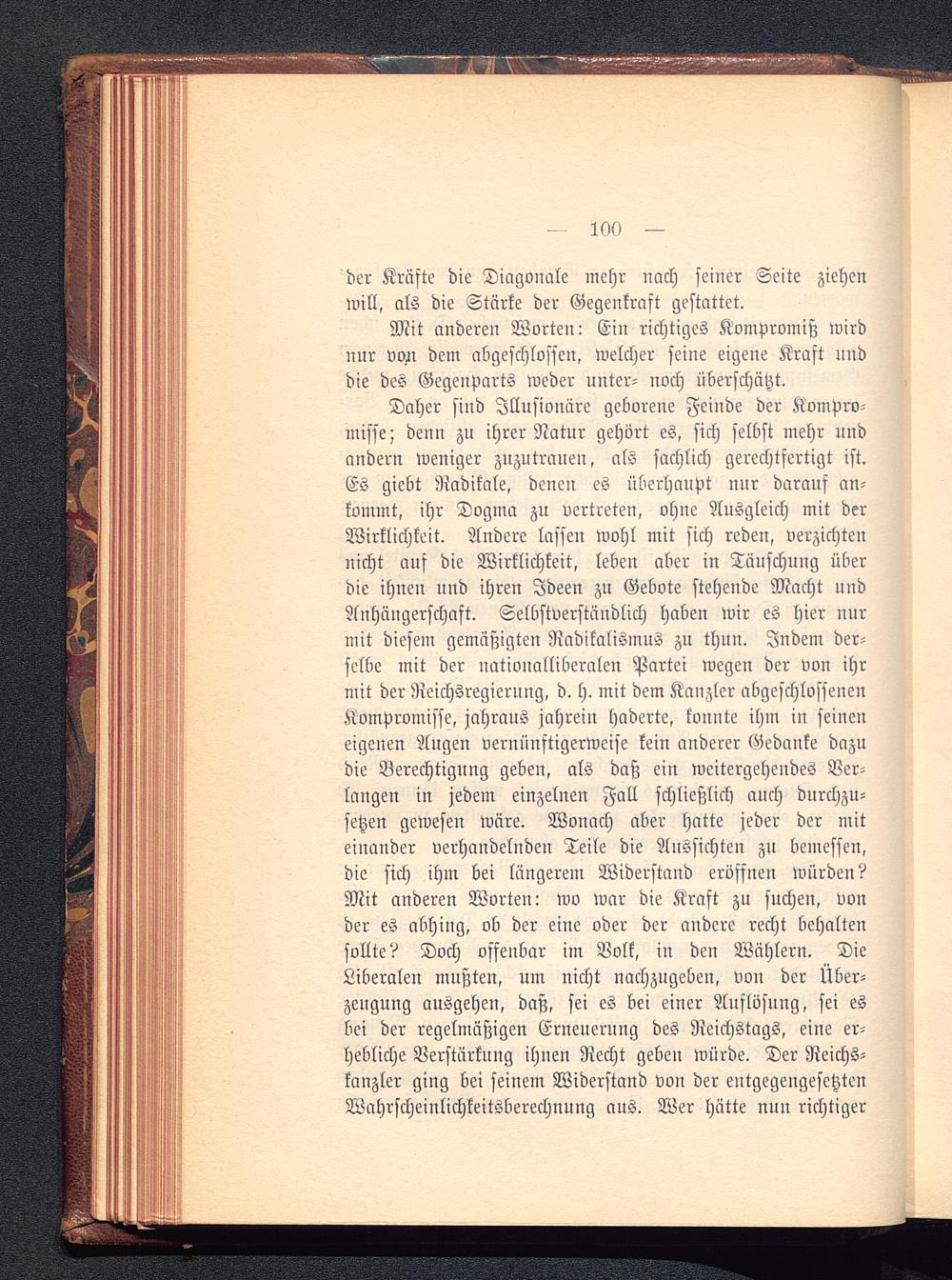 Daher siud Illusionäre geborene Feinde der Kompro-misse ; denn zu ihrer Natur gehört es, sich selbst mehr undandern weniger zuzutrauen, als sachlich gerechtfertigt ist.Es giebt Radikale, deneu es überhaupt nur darauf an-kommt, ihr Dogma zu vertreten, ohne Ausgleich mit derWirklichkeit. Andere lassen wohl mit sich reden, verzichtennicht auf die Wirklichkeit, leben aber in Täuschung überdie ihneu uud ihren Ideen zu Gebote steheude Macht undAnhängerschaft. Selbstverständlich haben wir es hier nurmit diesem gemäßigten Radikalismus zu thun. Indem der-selbe mit der nationalliberalen Partei wegen der von ihrmit der Reichsregierung, d. h. mit dem Kanzler abgeschlossenenKompromisse, jahraus jahrein haderte, konnte ihm in seineneigenen Augen vernünftigerweise kein anderer Gedanke dazudie Berechtigung geben, als daß ein weitergehendes Ver-langen in jedem einzelnen Fall schließlich auch durchzu-setzen gewesen wäre. Wonach aber hatte jeder der miteinander verhandelnden Teile die Aussichten zu bemessen,die sich ihm bei längerem Widerstand eröffnen würden?Mit anderen Worten: wo war die Kraft zu suchen, vonder es abhing, ob der eine oder der andere recht behaltensollte? Doch offenbar im Volk, in den Wählern. DieLiberalen mußten, um nicht nachzugeben, von der Über-zeugung ausgehen, daß, sei es bei einer Auflösung, sei esbei der regelmäßigen Erneuerung des Reichstags, eine er-hebliche Verstärkung ihnen Recht geben würde. Der Reichs-kanzler ging bei seinem Widerstand von der entgegengesetztenWahrscheinlichkeitsberechnung aus. Wer Hütte nun richtiger